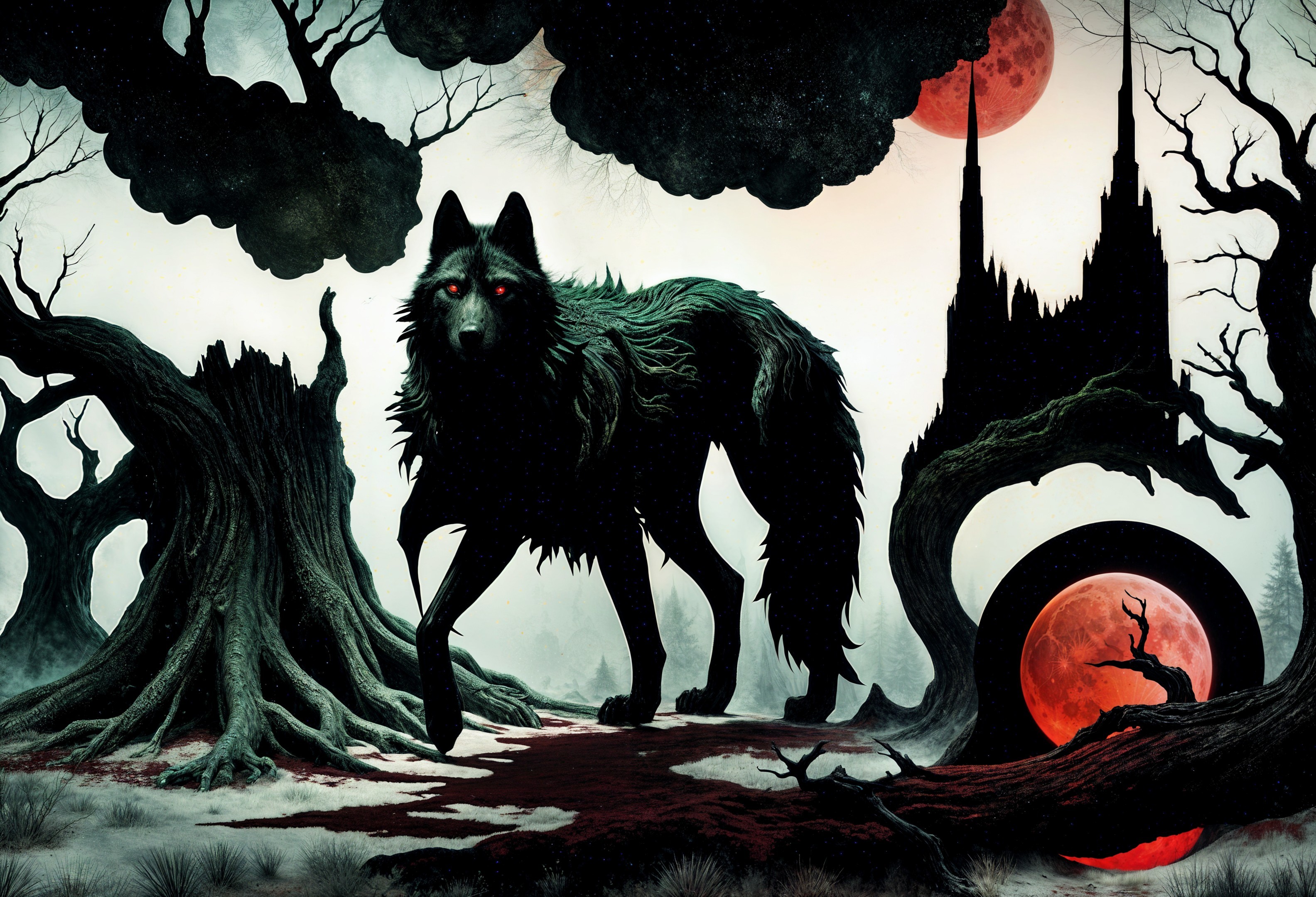 + Prompt:Surrealistic dark fantasy. Medium shot. Shadow creature tree-wolf move through the red and green forest at midnight under a blood moon. Distressed mixed media, haunting eerie darkness. Iridescent, metallic accents shimmer through dark muted colors on etched tree bark and twisted roots. Vibrant stars swirl across the night sky above. Blood red moonlight filters through mist, casting an ominous glow. H.R. Giger inspired biomechanical forms, Dave McKean inspired mixed media textures, Bill Sienkiewicz inspired dark mysticism. Dark, vibrant, eerie, cosmic horror, otherworldly, mystical, ancient, mysterious, twisted, macabre, vibrant colors, metallic, iridescent, shimmering, cinematic, 8k resolution, high contrast