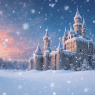 A majestic castle rises amidst a snowy landscape, its turrets glistening in the twilight. Snowflakes gently fall, creating a magical winter scene under a colorful sky.