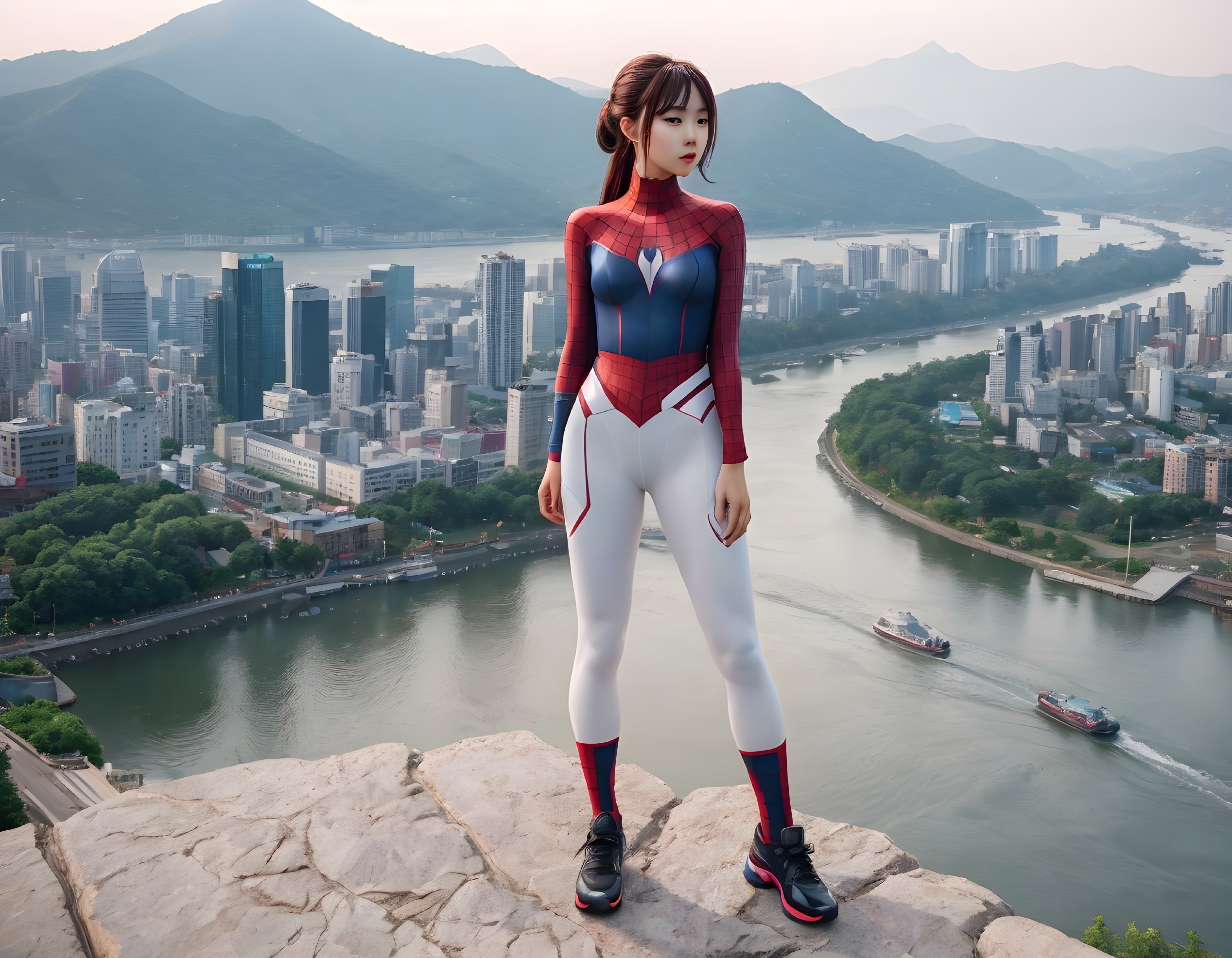 A gorgeous Korean K-Pop star dressed up like Spider-Gwen and overlooking the skyline of Seoul, South Korea with the Han River in the background.