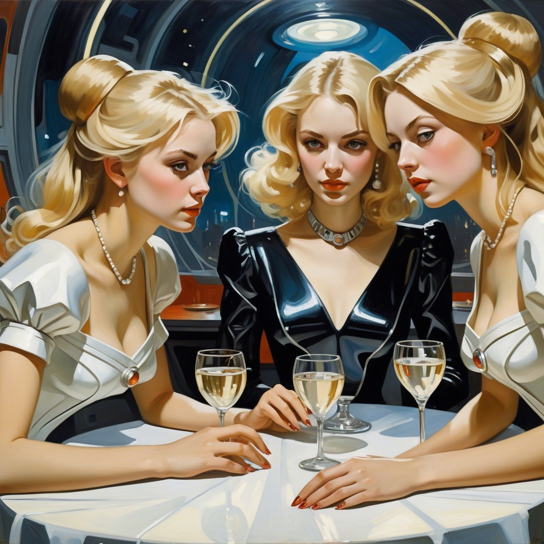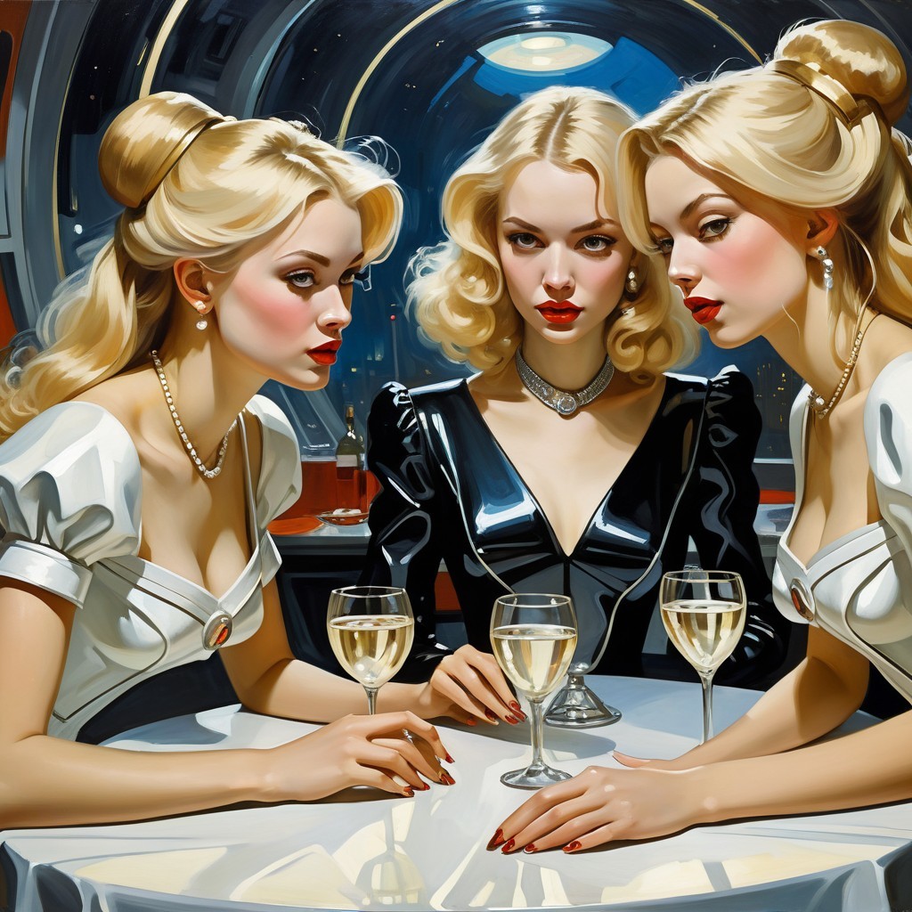 Three elegantly dressed women with blonde hair sit at a table, each holding a glass of wine. The scene is set against a futuristic backdrop, highlighting their striking, identical features.