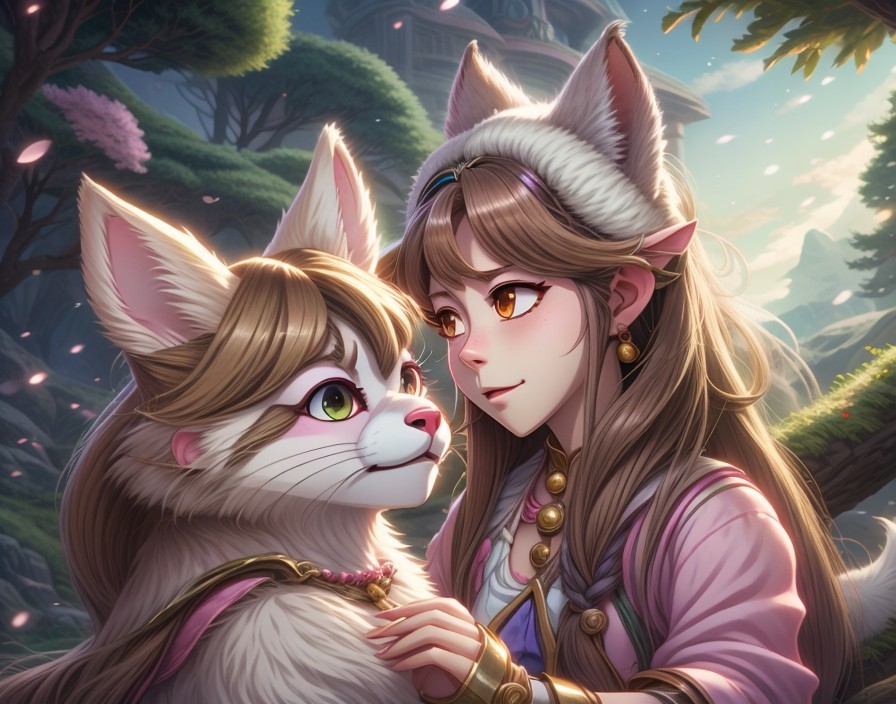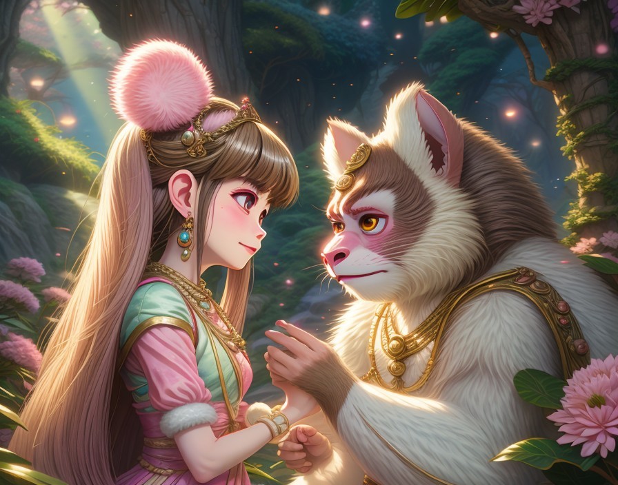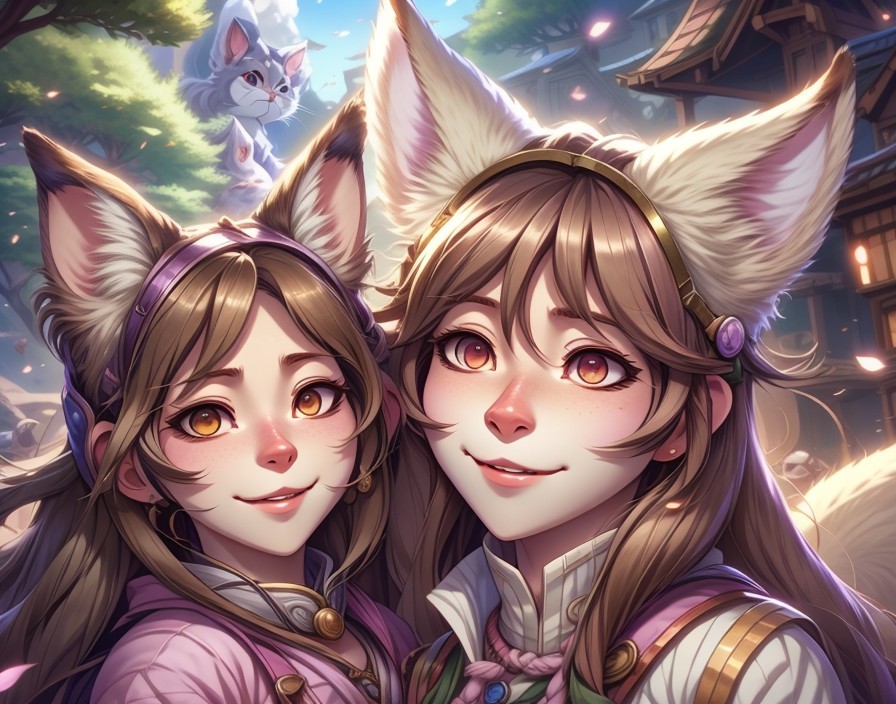 Two anthropomorphic fox characters with large, expressive eyes, wearing Victorian-inspired attire, are depicted with a quaint village backdrop at dusk.