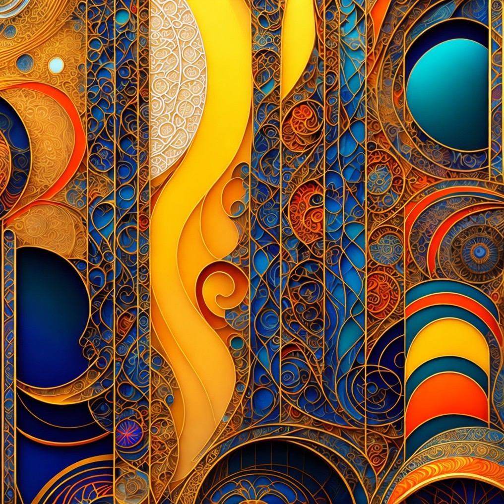 Ornate abstract design with swirling patterns, intricate gold filigree, and bold blue circles on a deep orange background.