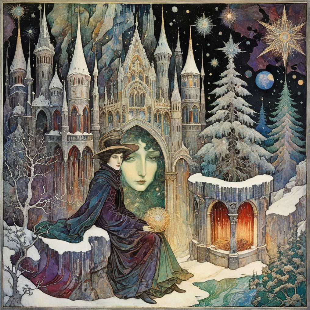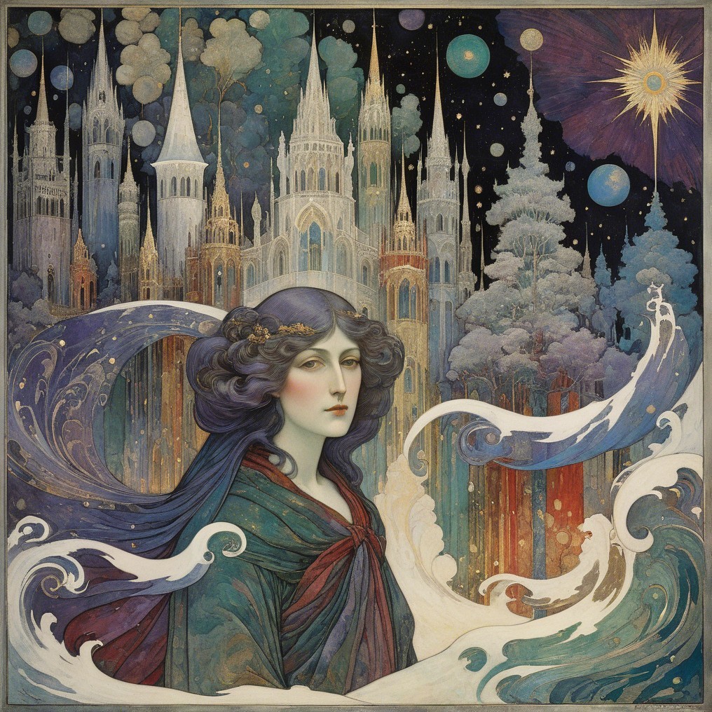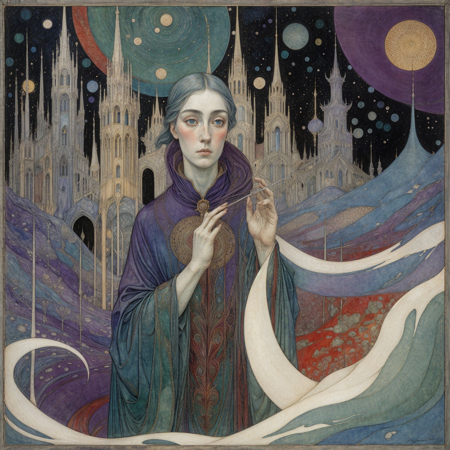 A serene figure draped in a flowing blue cloak stands amidst swirling colors and ethereal landscapes, holding a slender wand, evoking a sense of mystery and enchantment in a dreamlike setting.