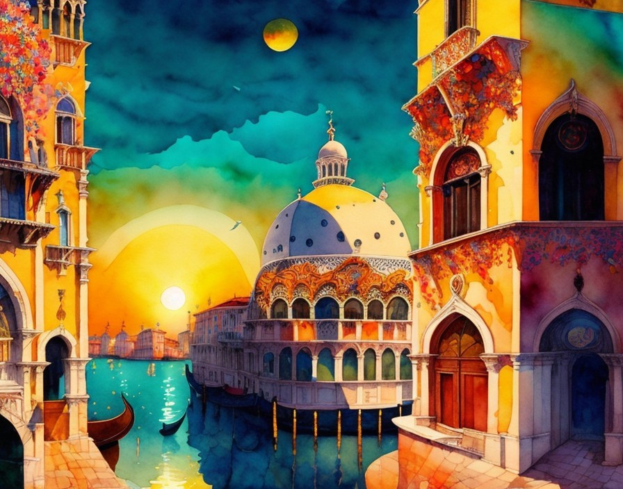 Prompt: "Full page, single image, 3D watercolor, spectacular high-definition sunrise over Venice, by Dee Nickerson, with elements of the style of Alphonse Mucha, with elements of Tingatinga style and Gustav Klimt style"