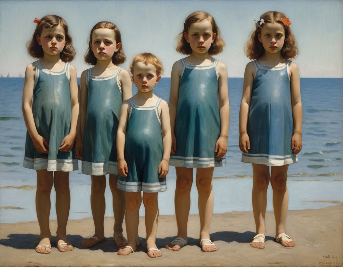 A painting of four girls and one boy, all in similar blue and white beachwear, standing solemnly on a Provincetown beach, the seaside town is on the site of the Mayflower’s landing in 1620  .