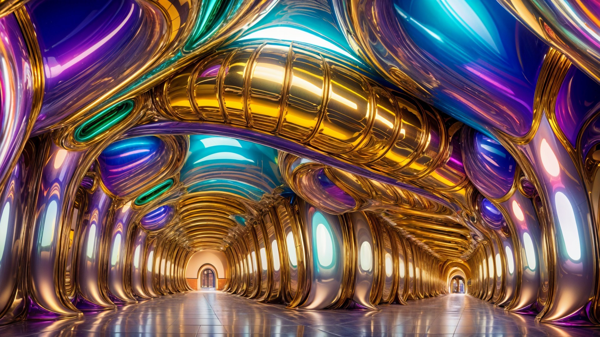 A vibrant, surreal landscape filled with colorful, swirling patterns and textures. Archways and stairs lead through a dreamy realm, reflecting hues of orange, blue, and purple in a serene waterway.