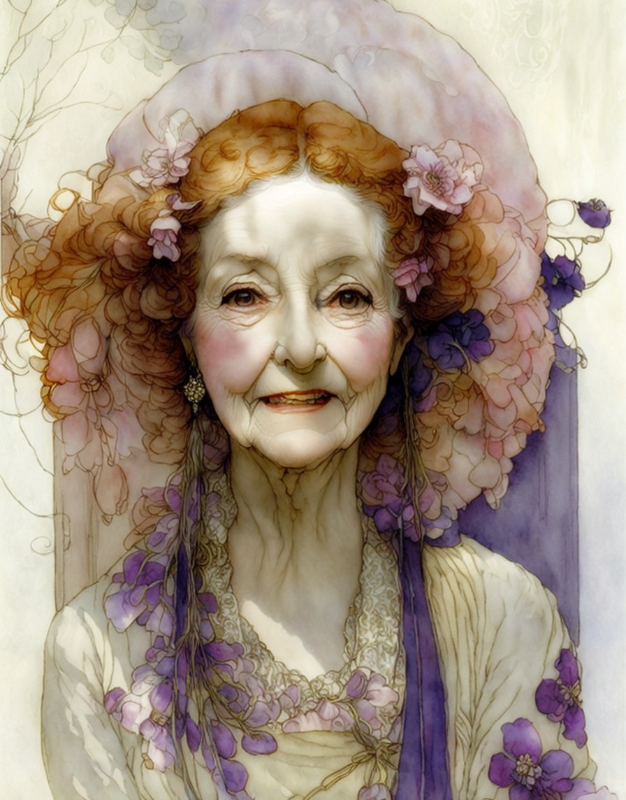 A cheerful elderly woman with curly hair adorned with flowers smiles warmly. She wears a delicate blouse and a pearl necklace, surrounded by a whimsical, dreamy background.