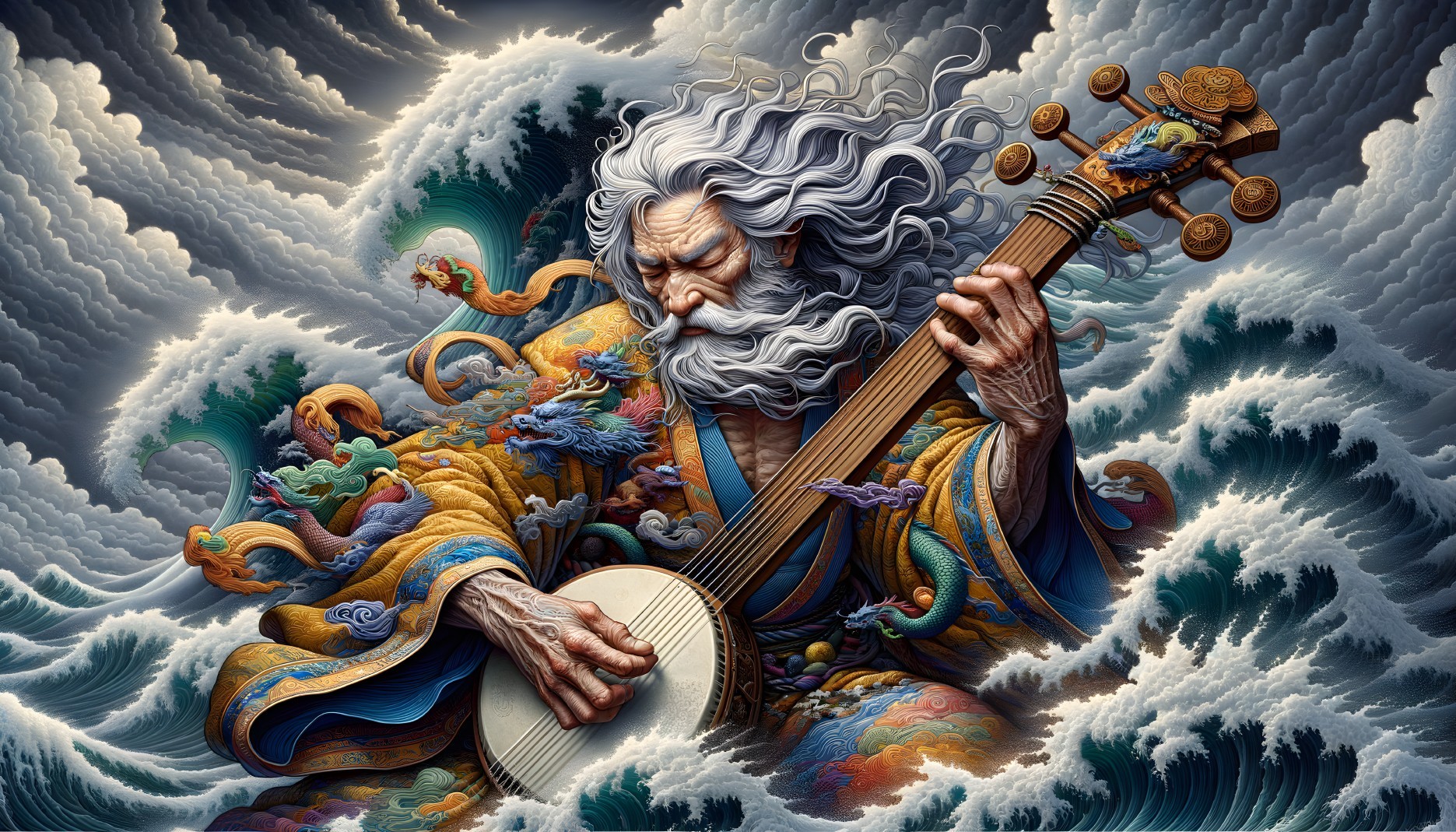 An illustration of a mythical figure with a long white beard playing a stringed instrument amidst swirling clouds and dragons.