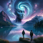 The image depicts a surreal landscape, featuring two figures gazing at a giant, abstract face against a cosmic sky. Swirling galaxies and mountains reflect in a tranquil lake, creating a dreamlike atmosphere.