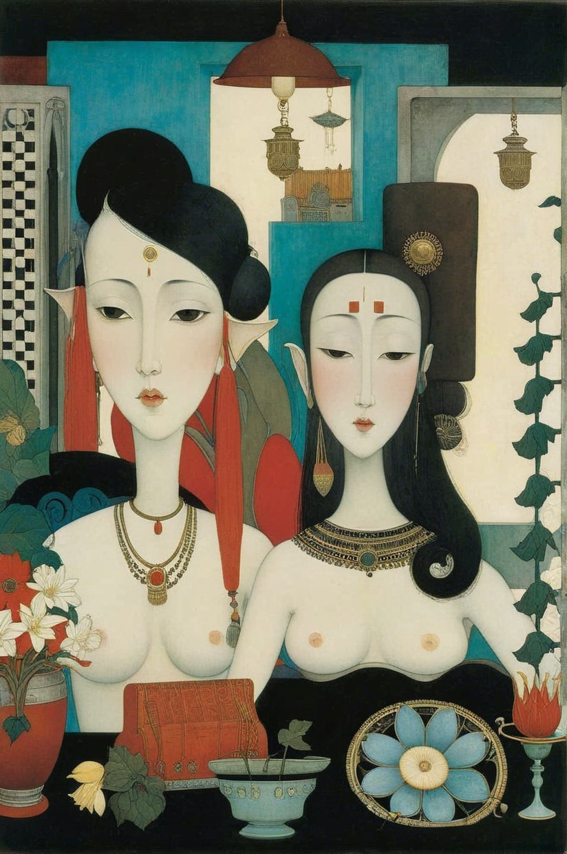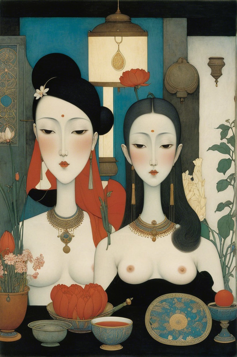 The artwork features three serene, elegant women with distinct hairstyles, adorned in beautiful jewelry, surrounded by blossoms and a small cat peeking from a vase, evoking tranquility and grace.