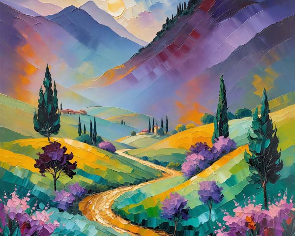 A vibrant watercolor landscape features rolling hills adorned with colorful autumn foliage, rocky outcrops, and quaint houses beneath a sunset sky, radiating warmth and serenity.