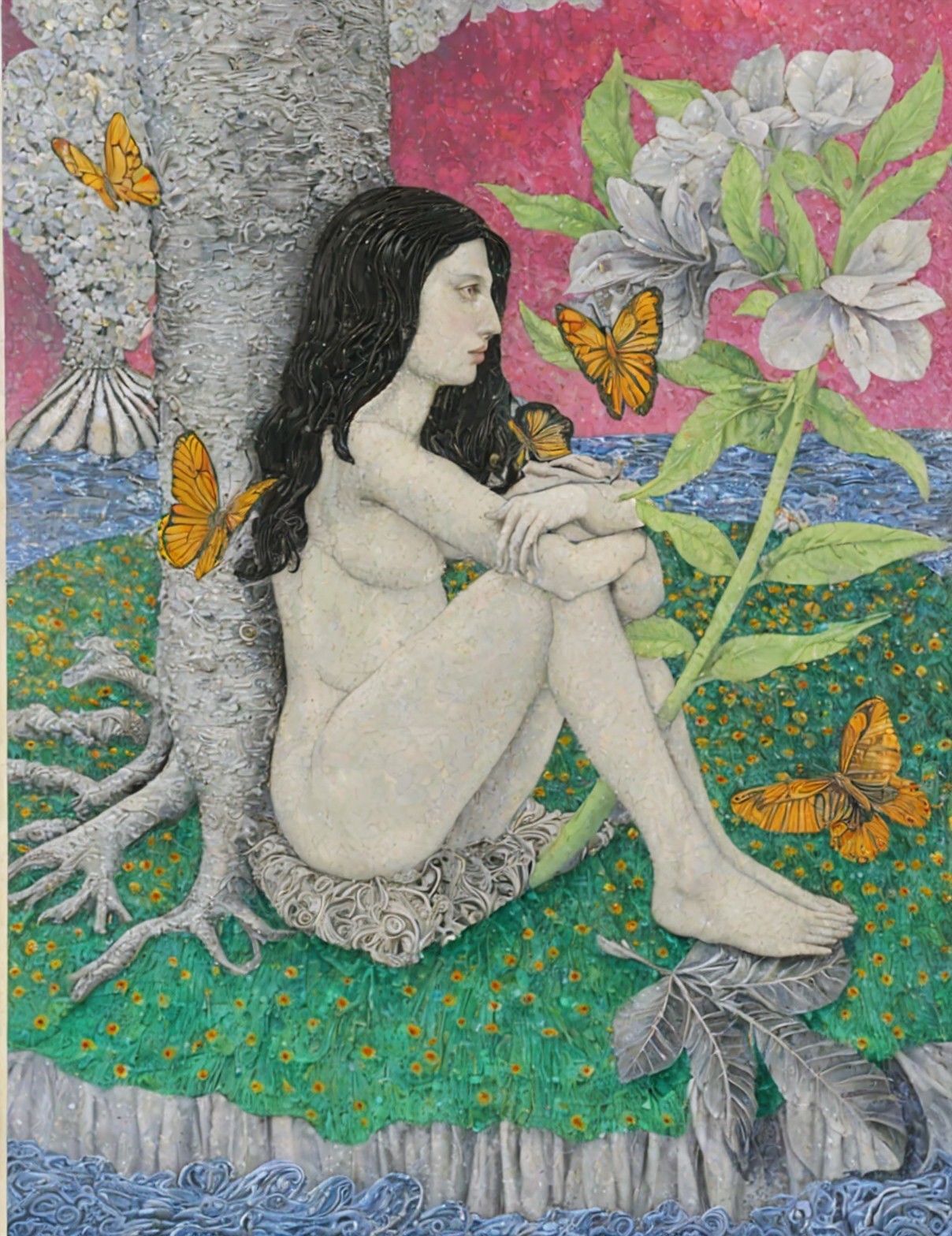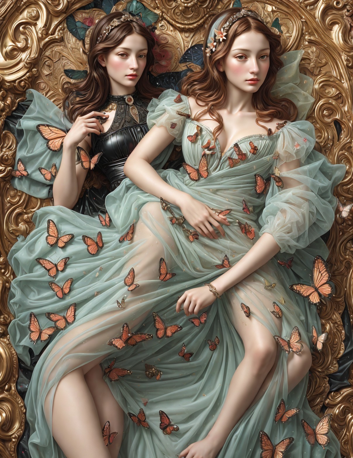 Illustration of twin women with floral crowns and blue dresses, surrounded by butterflies, with a decorative golden frame in the background.