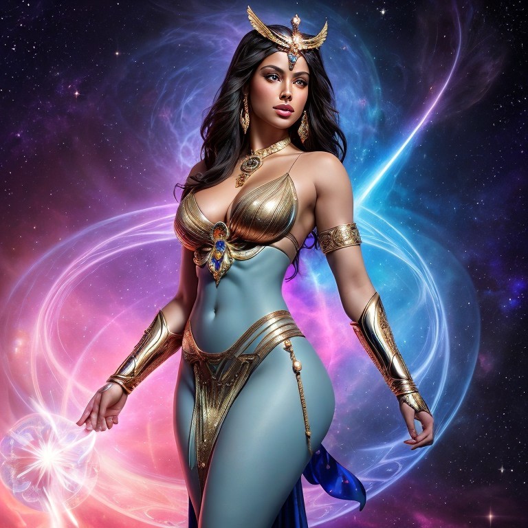 Prompt: "Promethea, the magic goddess, is a stunningly beautiful being with a physique that exudes power and elegance. She stands tall at around 5'9" with a lithe yet athletic build, her curves honed from centuries of wielding her magical abilities. Her skin is a radiant porcelain-like complexion with a subtle shimmer, as if infused with the essence of the stars. Her raven-black hair cascades down her back like a waterfall of night, with subtle hints of purple and indigo that seem to shift and change color depending on the light. Her eyes burn with an inner fire, blazing like two sapphires that sparkle with an otherworldly intensity. Her features are chiseled and refined, with high cheekbones, a small nose, and lips that curve into a perpetual enigmatic smile. A delicate filigree of silver and gold adorns her ears, wrists, and throat, pulsing with a soft blue glow that seems to reflect the rhythm of the cosmos. As she moves, her very presence seems to command attention, as if the air itself responds to her magic."