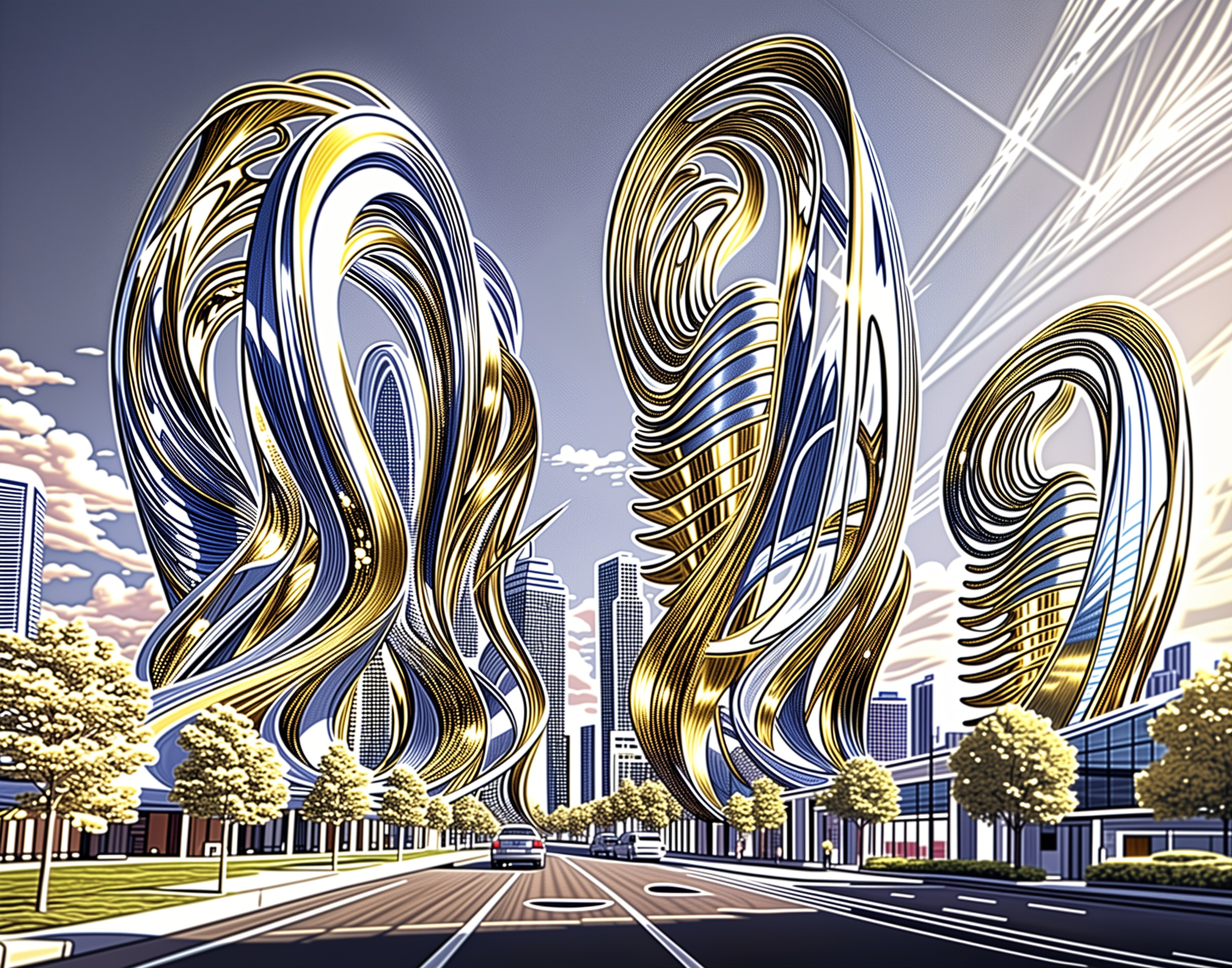 A futuristic public art installation with golden swooping loops and blue accents against an urban skyline with onlookers.