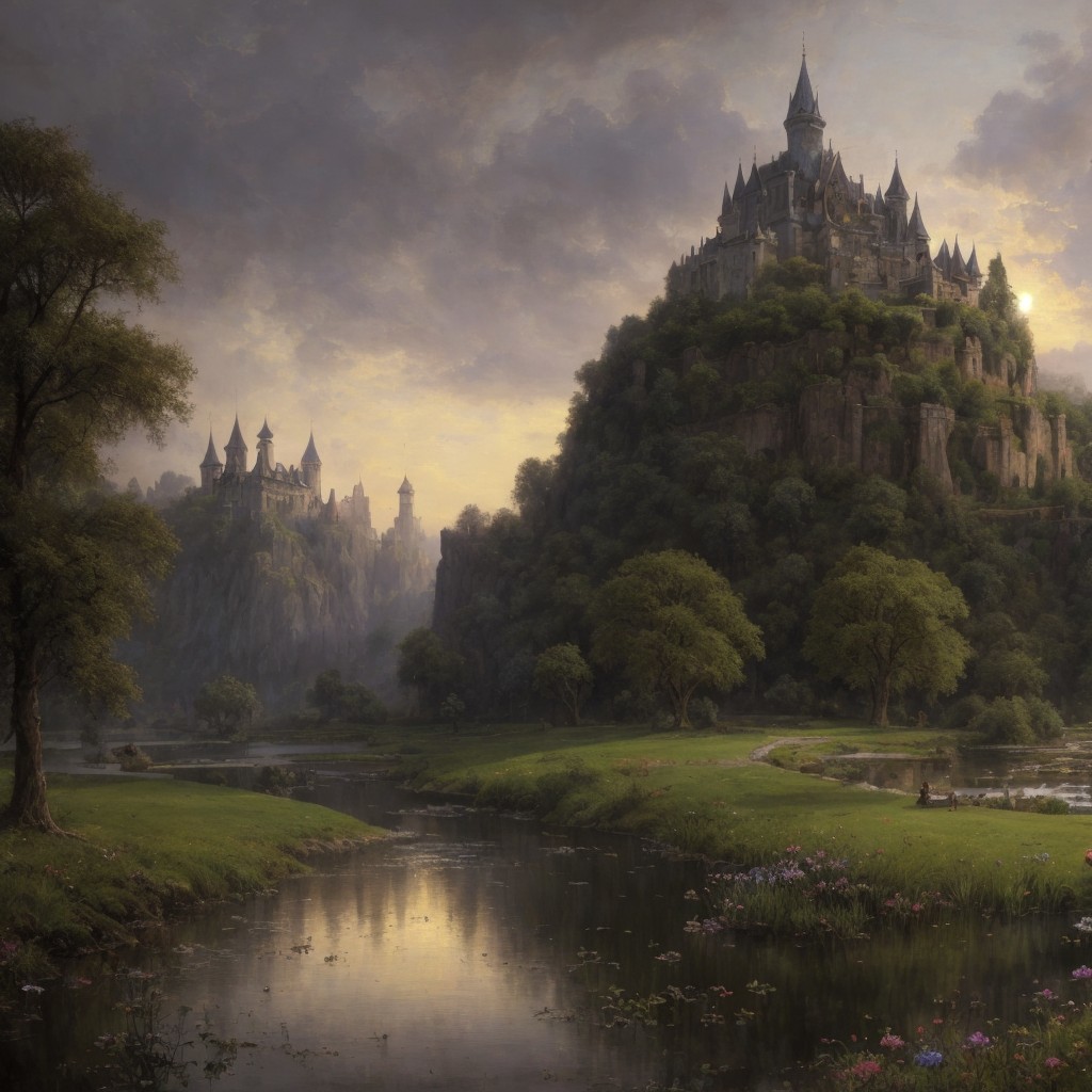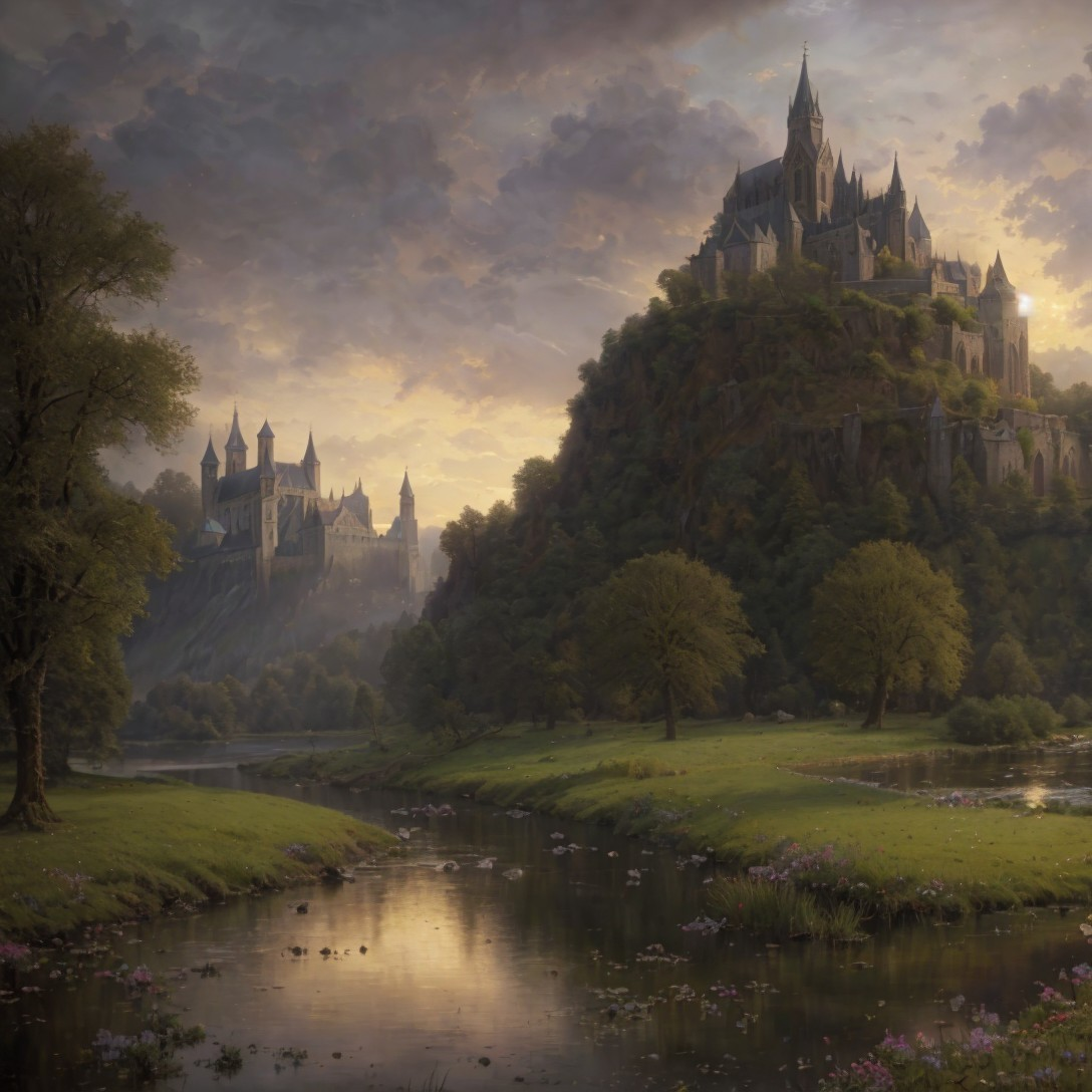 An idyllic landscape with a majestic castle on a hill, a serene river in the foreground, surrounded by lush greenery under a dusky sky.