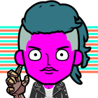 A colorful cartoon character with spiky blue hair and a bold expression holds up a finger as if making a statement. The vibrant background features stripes and a textured, sparkly effect.