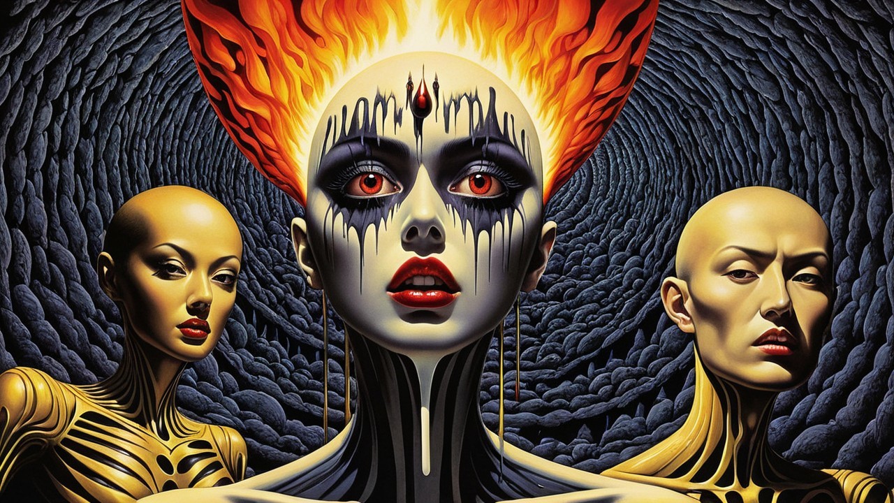 Prompt: "Don't you burning burn me? With surrealist elements in the style of Junji Ito, Henry Patrick Clarke, Igor Morski, Georgia O'Keefe, Gediminas Pranckevicius and Naoto Hattori. Ink, pen and oil. Sharp contrast. Labial and vulvic Ensure all significant elements are fully within the boundaries."