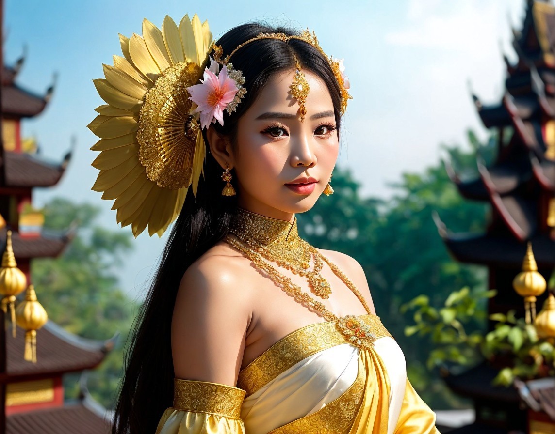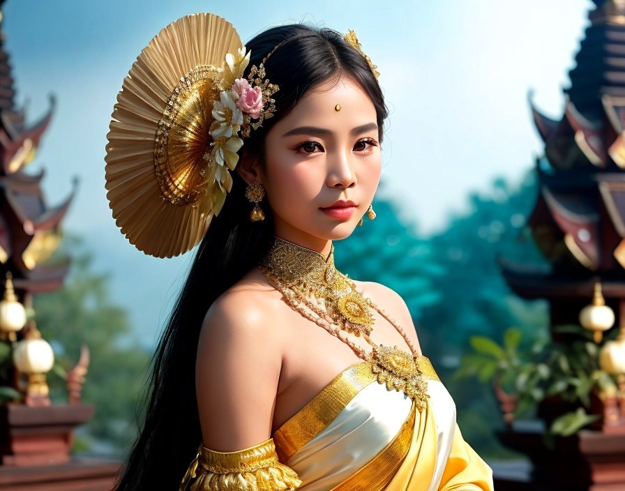 A woman in traditional attire with a large sunflower headpiece stands before an Asian temple, petals floating around her.