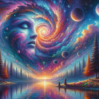 A vibrant landscape features swirling clouds in hues of orange and blue, reflecting in a serene lake. Two figures stand by the water, surrounded by autumn trees and majestic mountains.