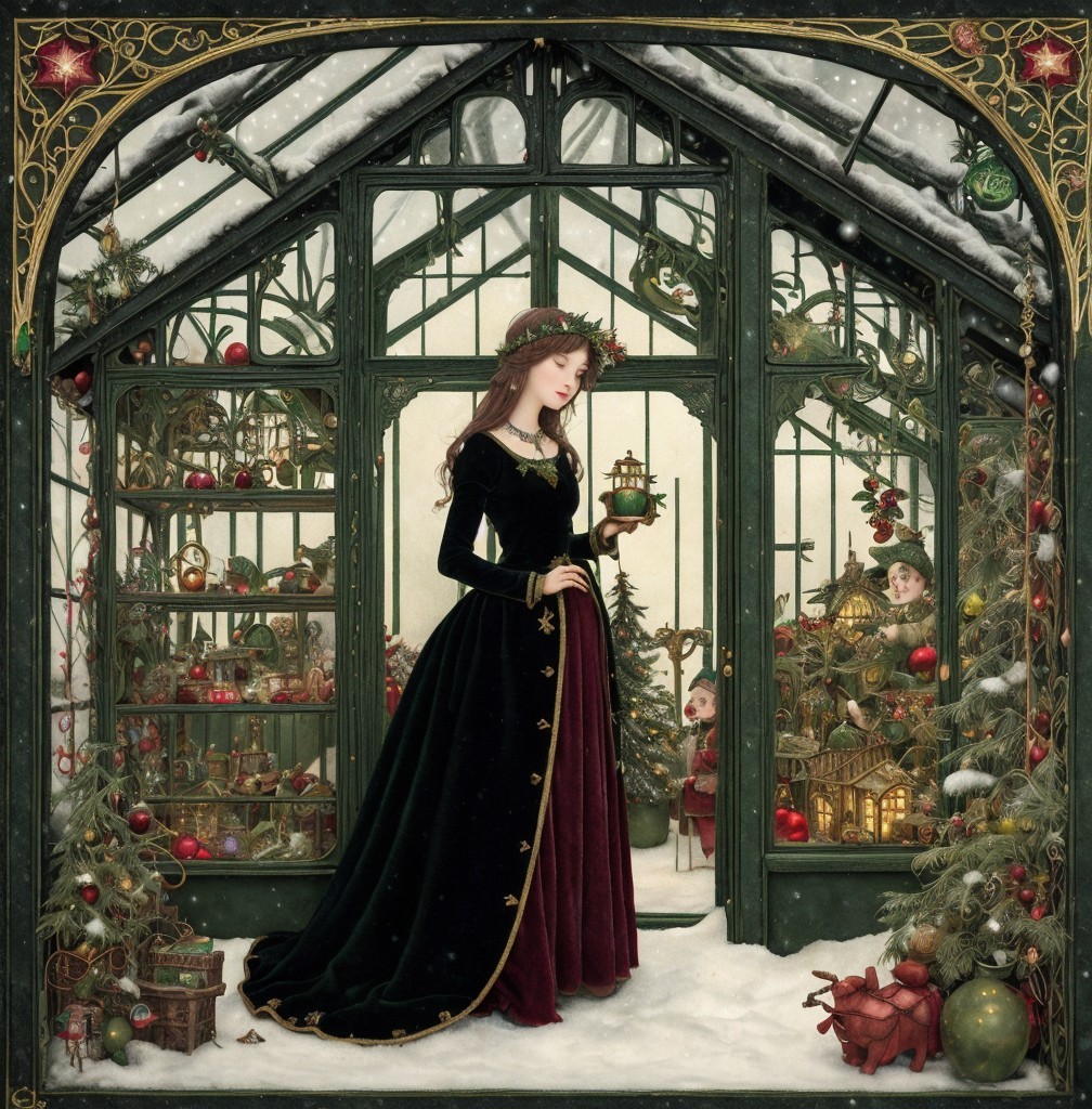 Legend of the Christmas girl and the magical Christmas greenhouse ,, 3rd century vintage Venetian miniature art. Velvet Black, Shabby, Dull Gold, olive green, burgundy, Golden Ratio, Surreal Fantasy, Elegant, High Definition Ultra Fine 3D Line, Zenangle Style, Watercolor Patchwork , Arthur Rackham Style, Paul Kidby, Gediminas Prankevicius, Jacek Jerka, Extremely Detailed, Intricate, Thoughtful, HDR, Fractal, Beautiful, Award Winning, Fantasy Look, Fantasy, Crisp Quality