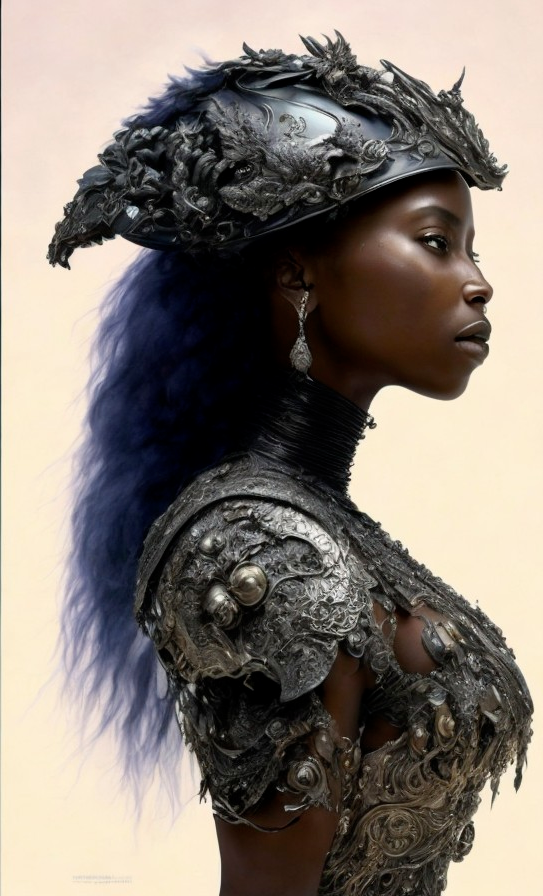 A woman in ornate metallic armor and headdress, presenting a profile view with an elegant posture and a solemn expression.