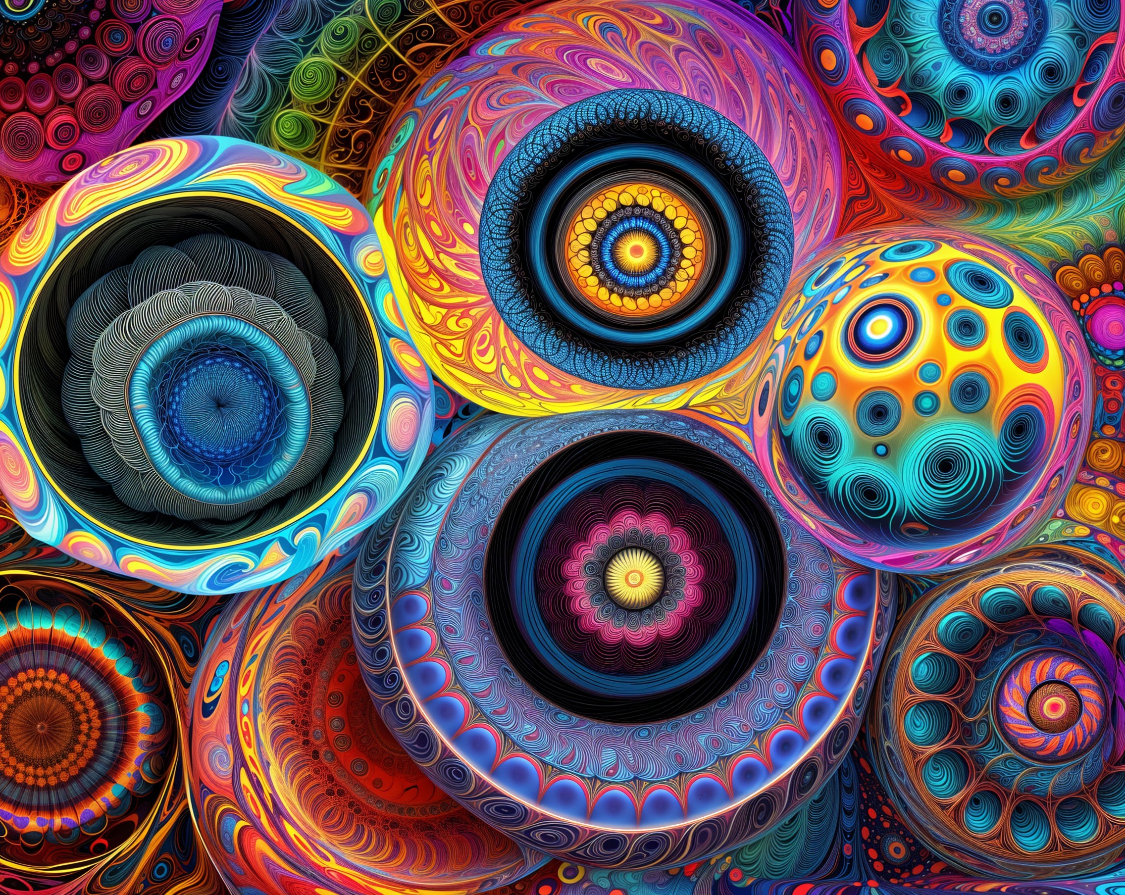 A vibrant pattern of circular designs, radiating in vivid hues of blue, purple, teal, and orange. Each circle features intricate details and textures, creating a mesmerizing, kaleidoscopic effect.