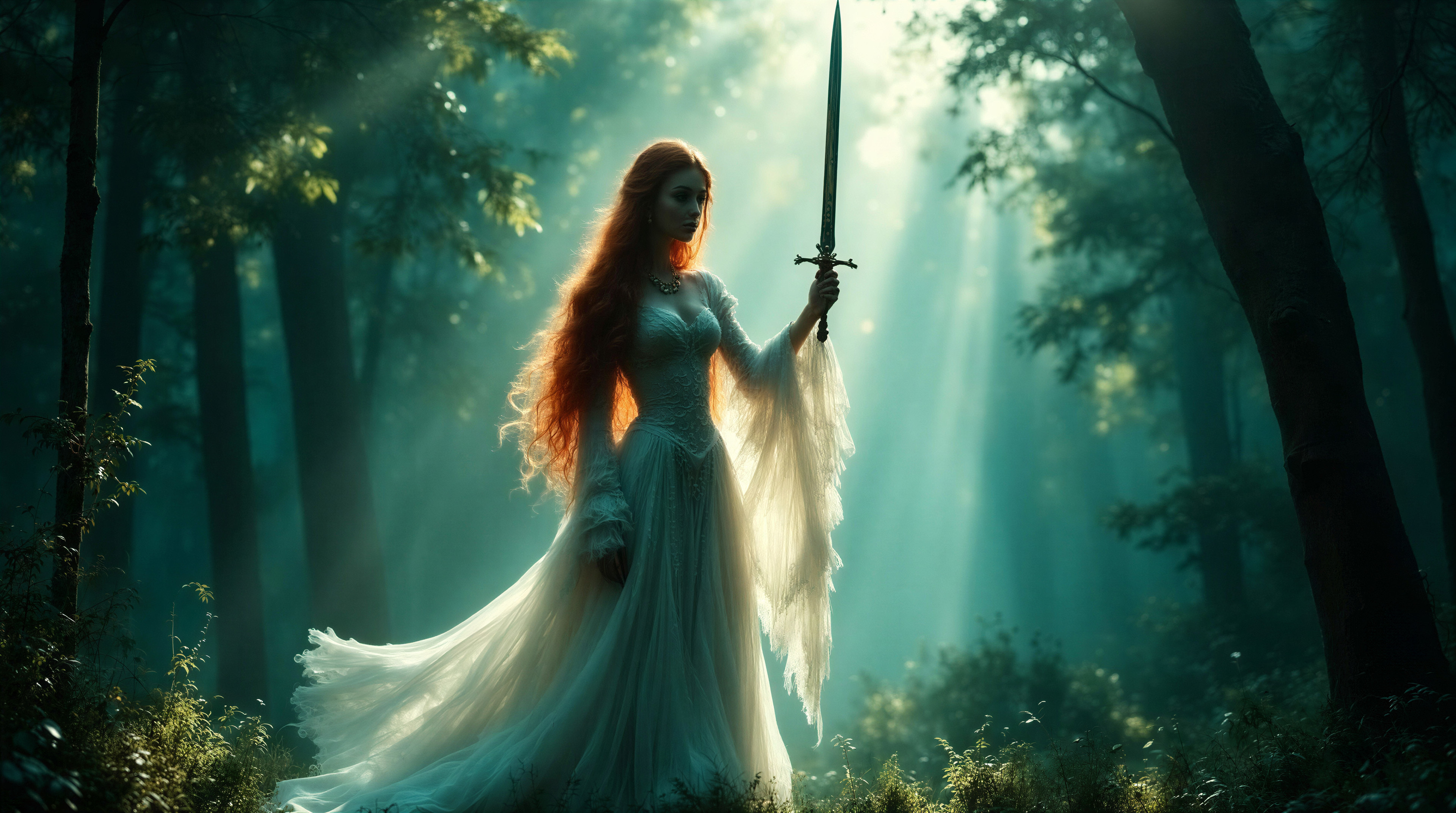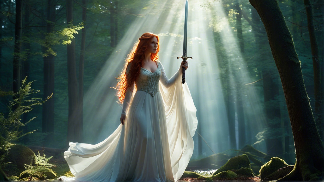 A mystical scene features a woman in a flowing white dress, holding a sword. She stands in a sunlit forest, surrounded by soft, ethereal light filtering through the trees.