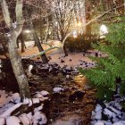 An aerial view of a winter wonderland, with a winding river flowing through a snow-covered landscape. The river reflects the warm glow of street lamps and a large, intricately branched tree that dominates the center of the image. Surrounding the river and the tree are various snow-dusted bushes and trees