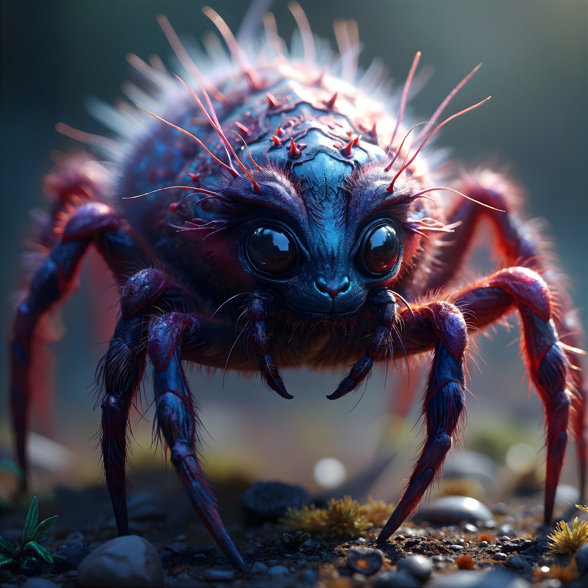 This artwork features a fantastical hybrid creature with shimmering fur and iridescent colors, adorned with intricate web patterns. Its eight legs and large expressive eyes create an eerie ambiance, enhanced by vibrant textures and mystical lighting. The hyperrealistic digital painting showcases a colorful palette and cinematic postprocessing, resulting in a masterpiece that blends horror and surrealism in high