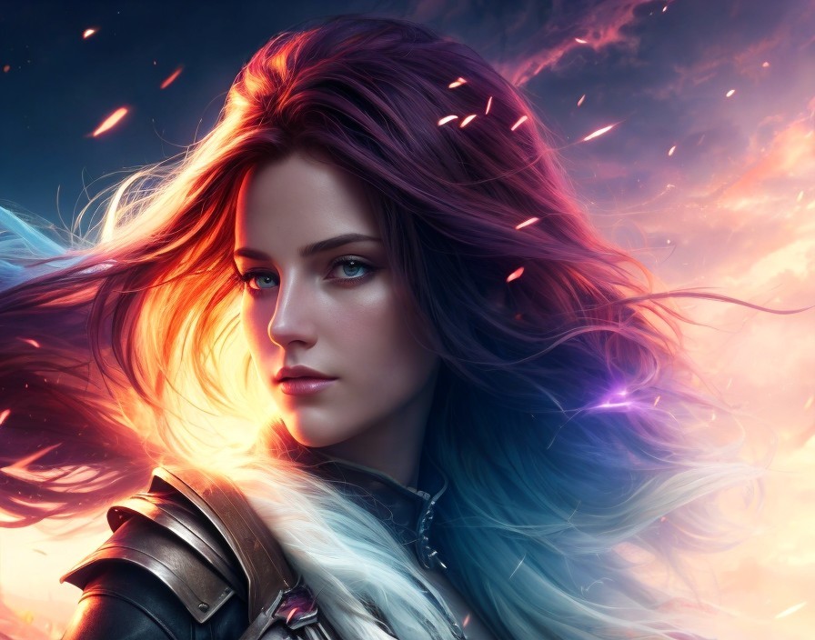 A digital artwork of a woman with flowing hair and intense eyes, set against a dramatic backdrop with fiery embers.