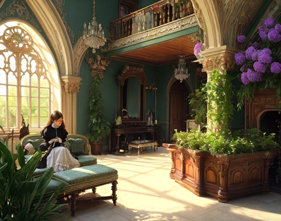 Vintage-clad woman in ornate room with sunlight and lush plants
