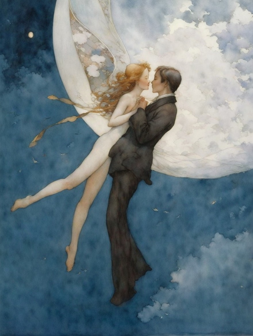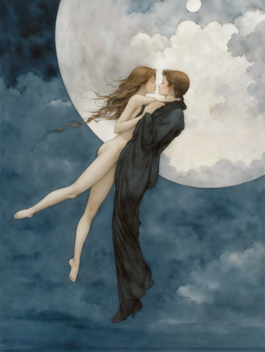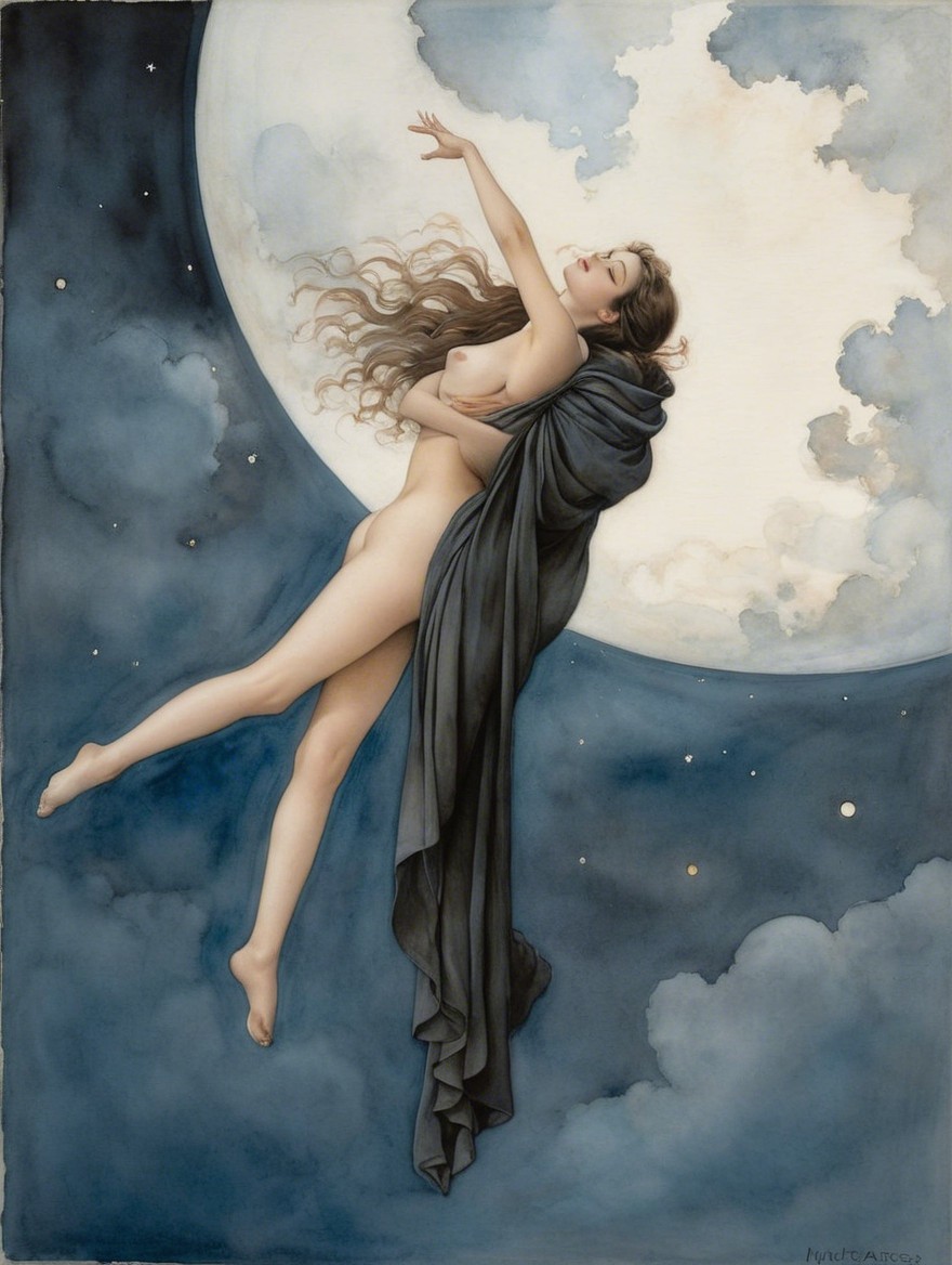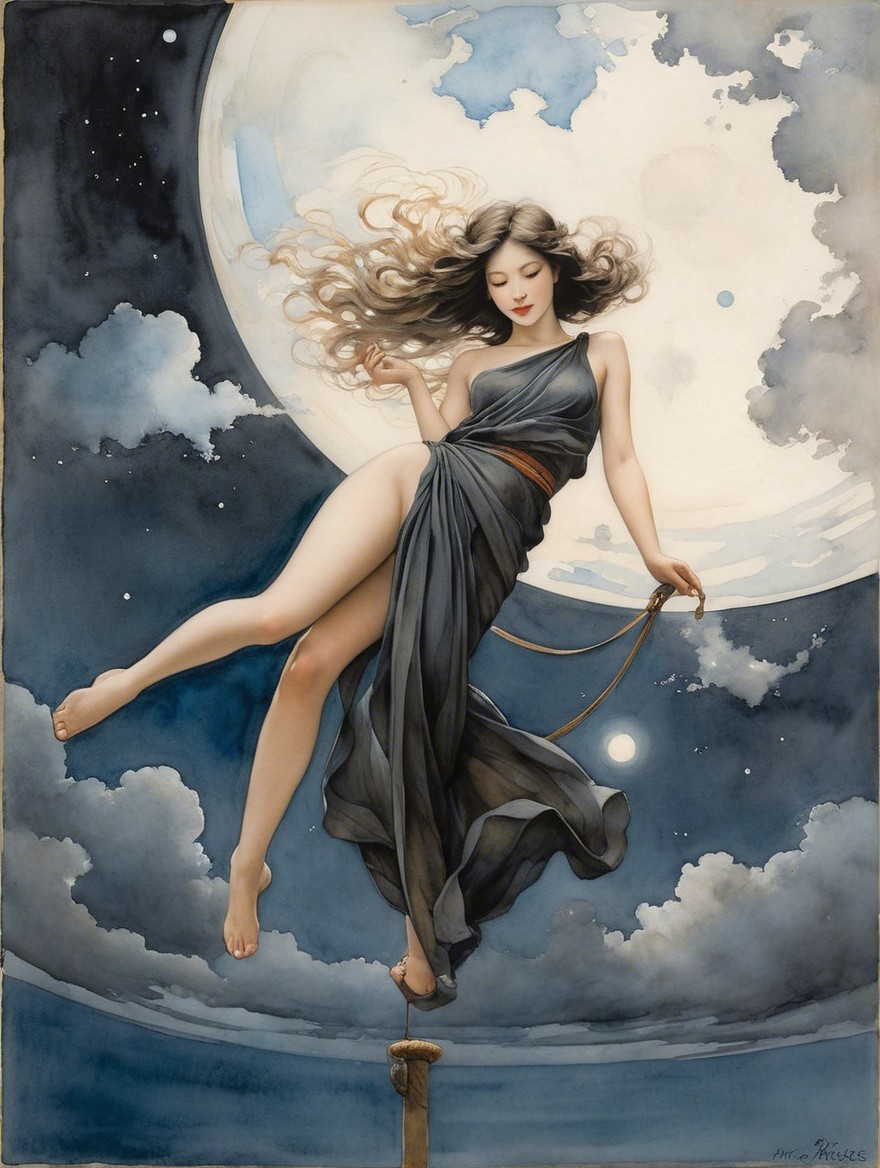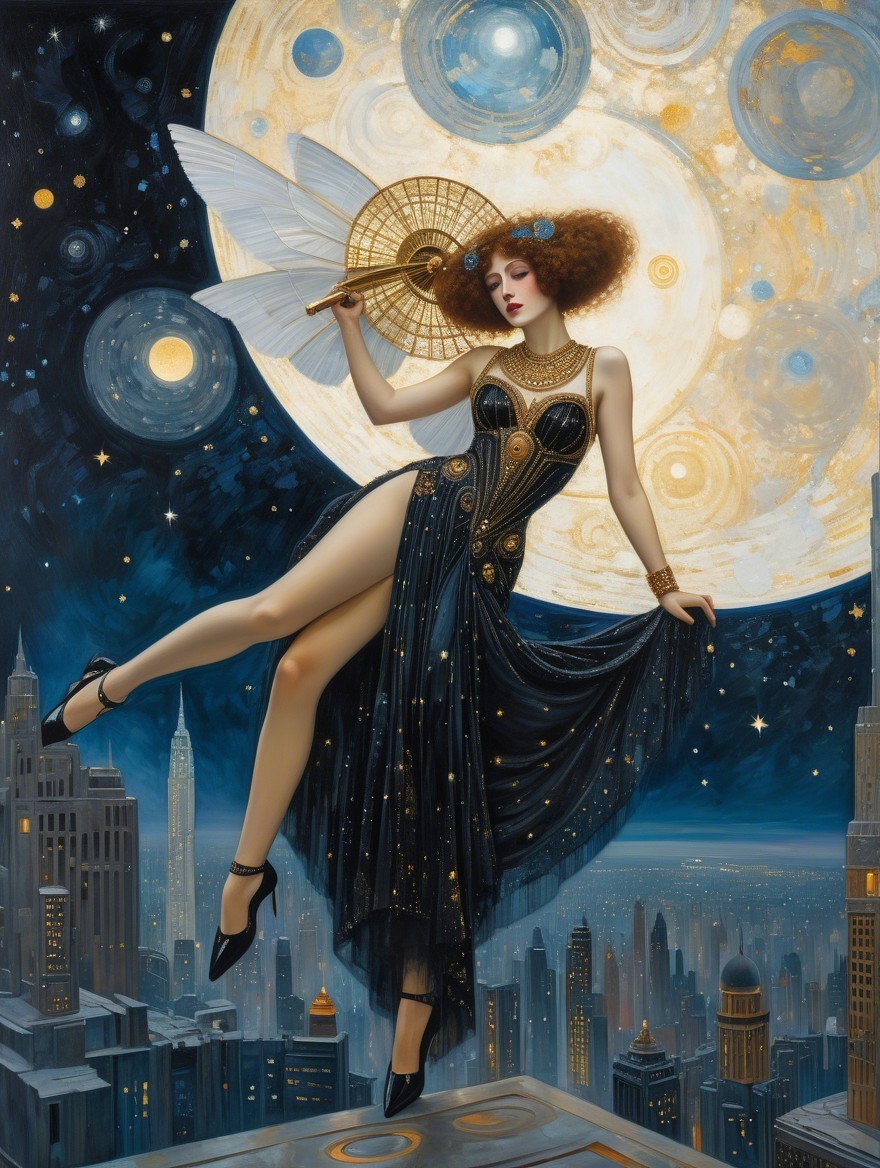 The image features a glamorous woman in a black corset and sheer skirt, posed against a starry night skyline. Futuristic circular patterns loom behind her, adding a surreal ambiance.
