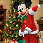 Mickey Mouse is dressed in a festive Santa outfit, complete with a bow tie and fur trim, posing cheerfully beside a beautifully decorated Christmas tree and colorful presents.