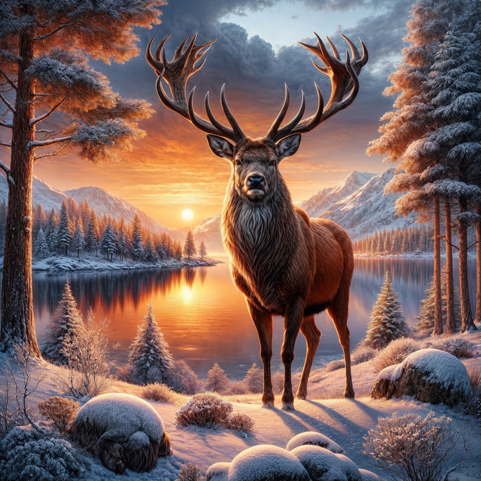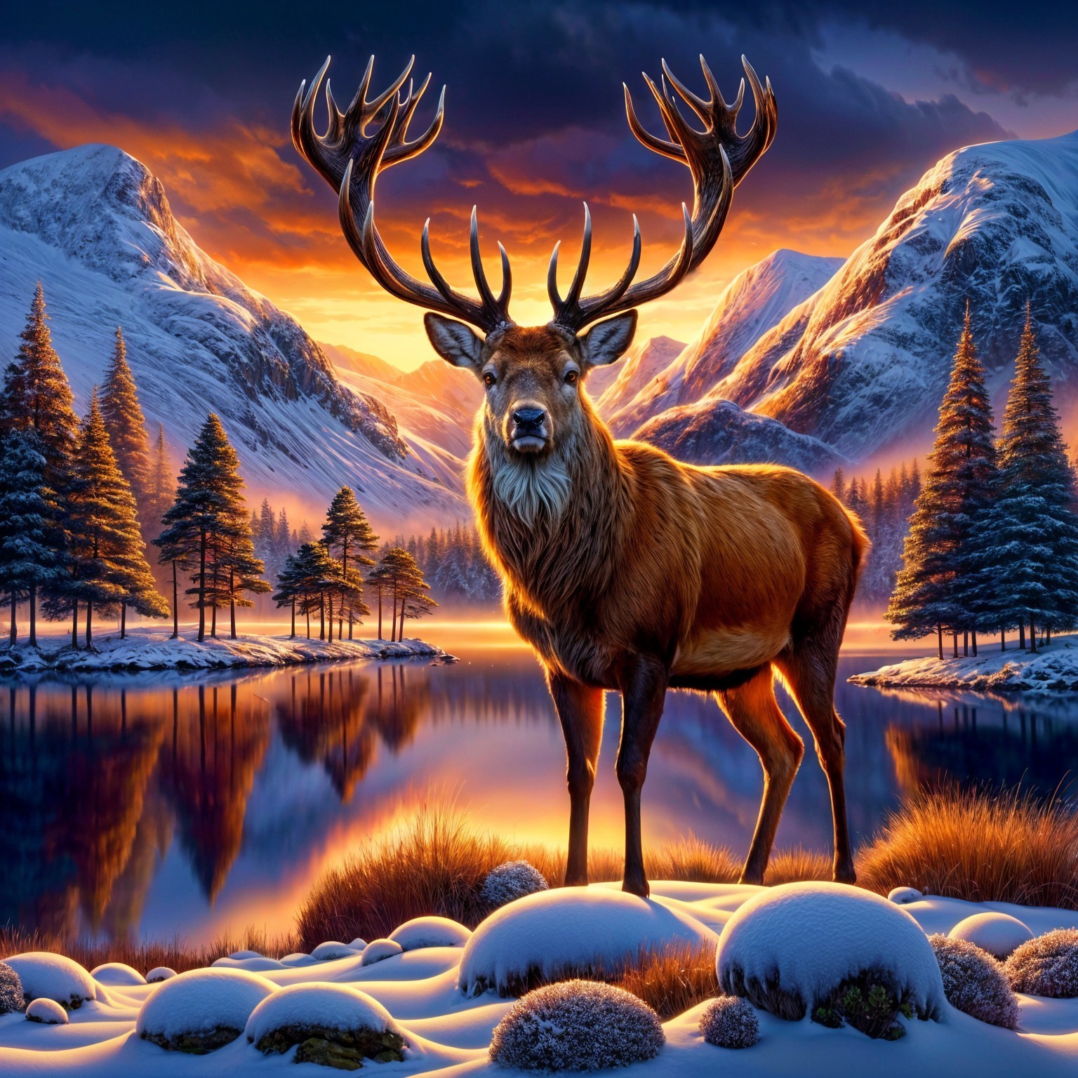 A majestic stag stands proudly in a picturesque landscape, framed by mountains and a serene lake at sunset. Its impressive antlers contrast beautifully with the vibrant sky.