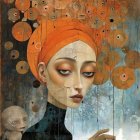 The painting features a somber young woman with striking orange hair, holding a delicate gesture. Golden circles contrast with cracked textures, creating a blend of beauty and fragility.Original Prompt CR Fransis