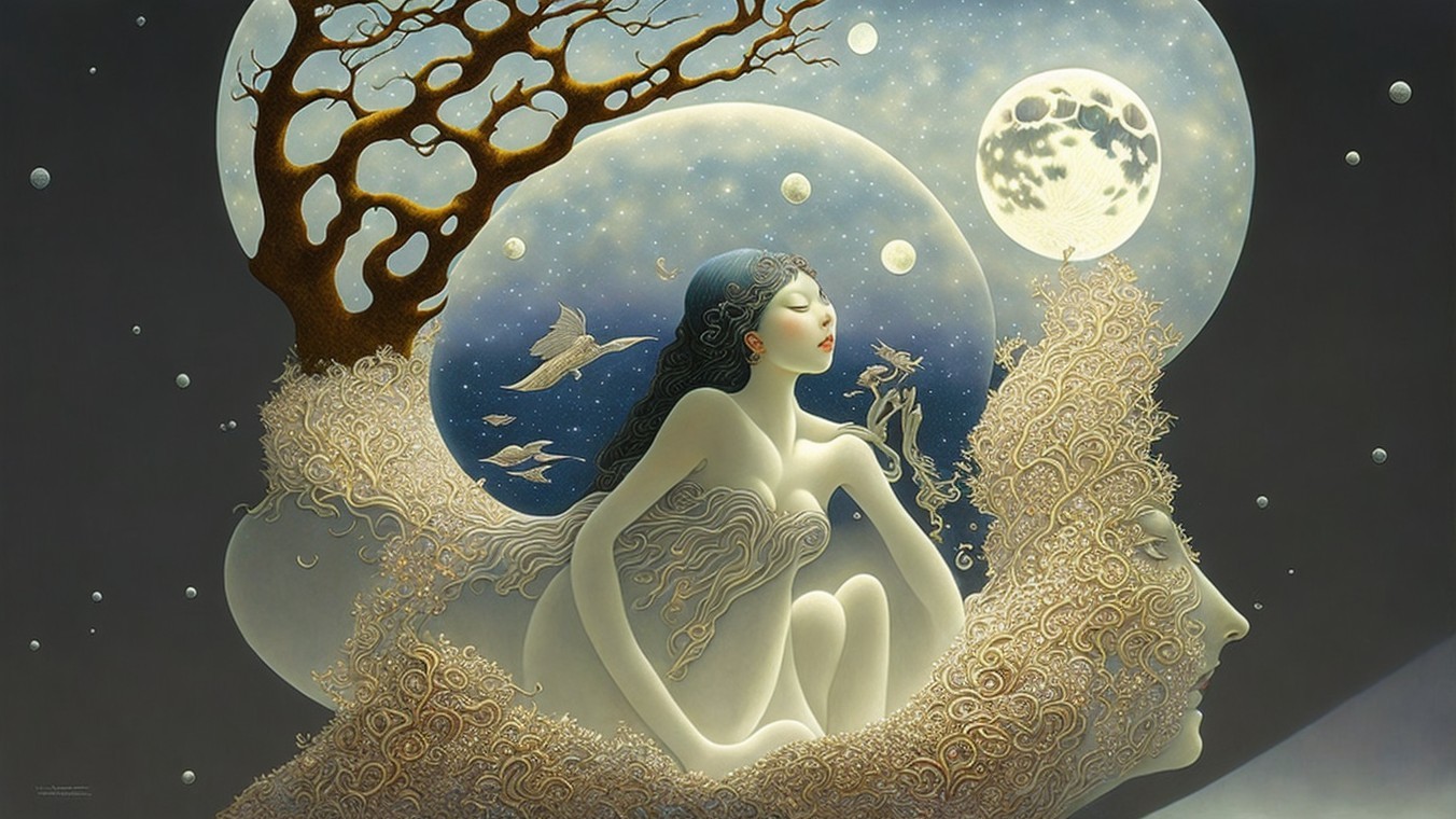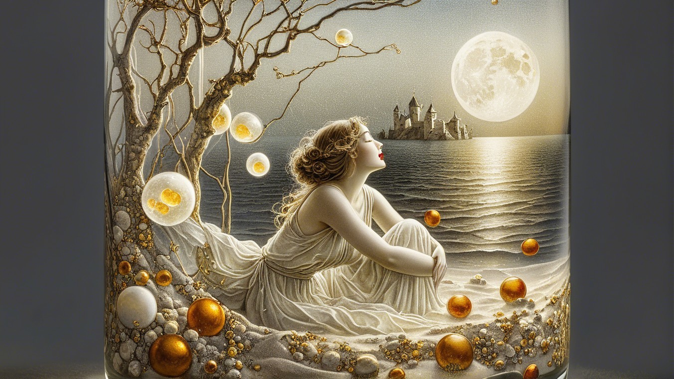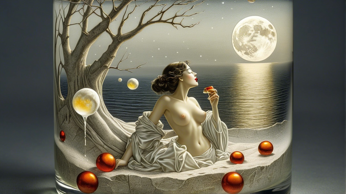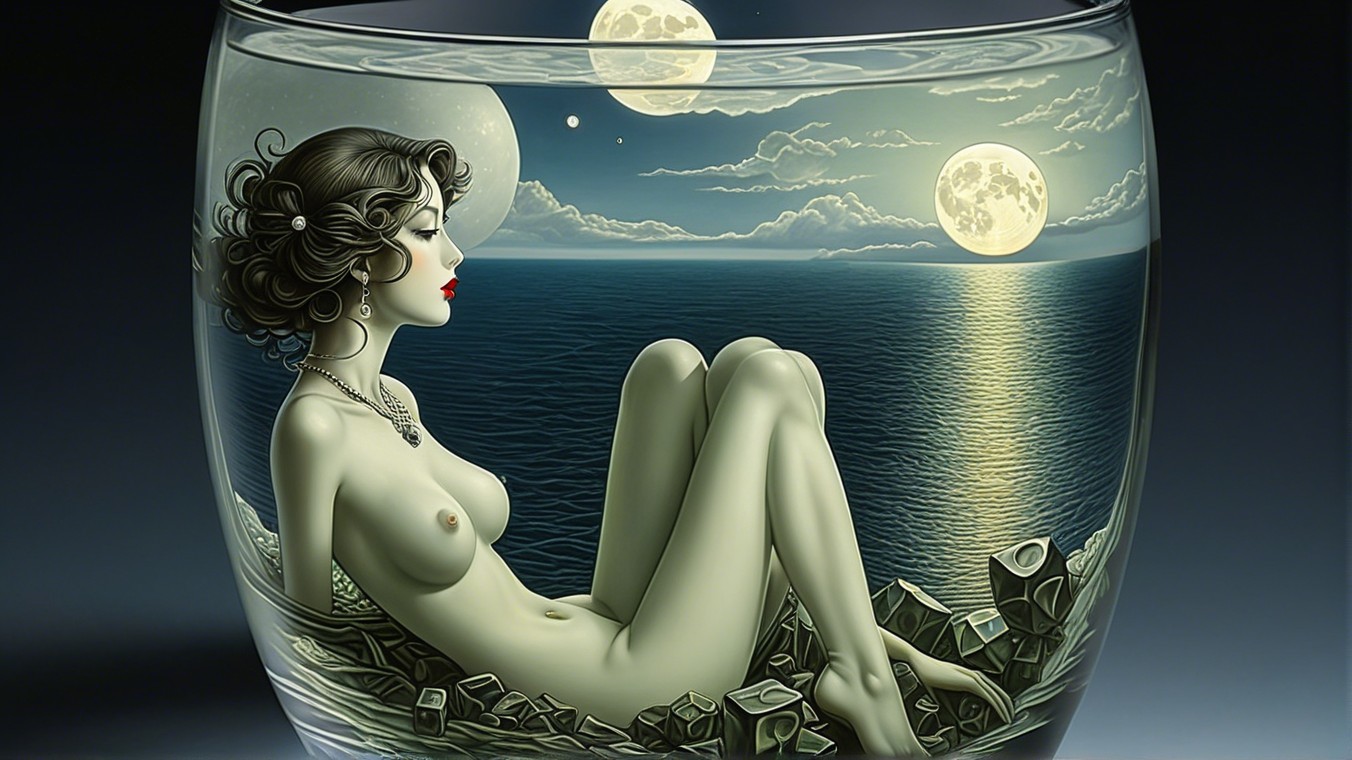 A whimsical scene depicts a woman in a bikini inside a glass filled with water, surrounded by illustrations of waves, a full moon, and floating ice cubes, creating a surreal, dreamy atmosphere.