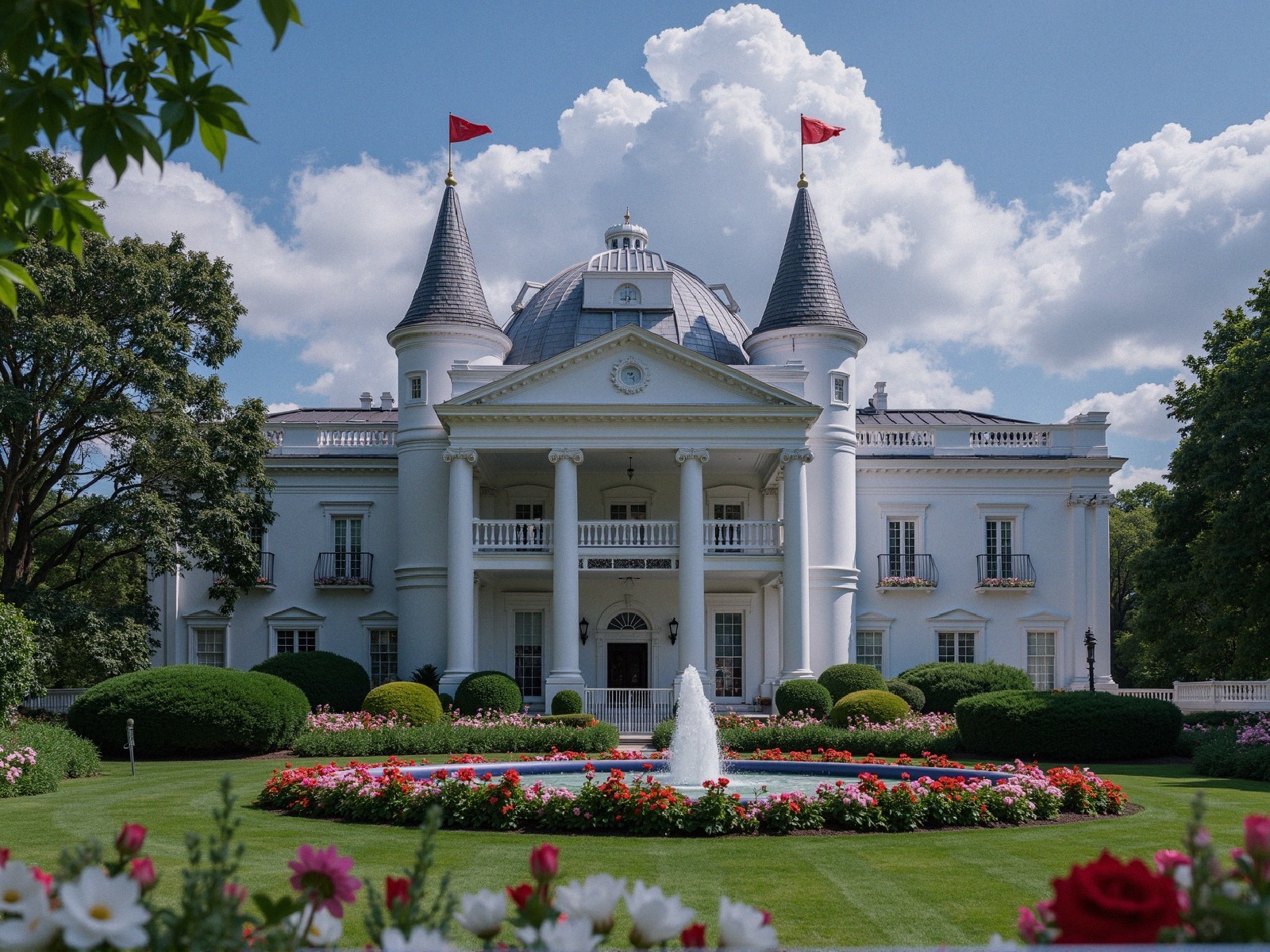 Prompt: The White House Northern facade, amusement park theme, architecturally impressive, influenced by Walt Disney, elements of a jumping castle, hyper-real