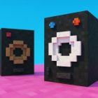 The image features two stylized boxes on a pink surface, one adorned with a circular design and a red band, while the other showcases a fan-like pattern with a green base and a star.