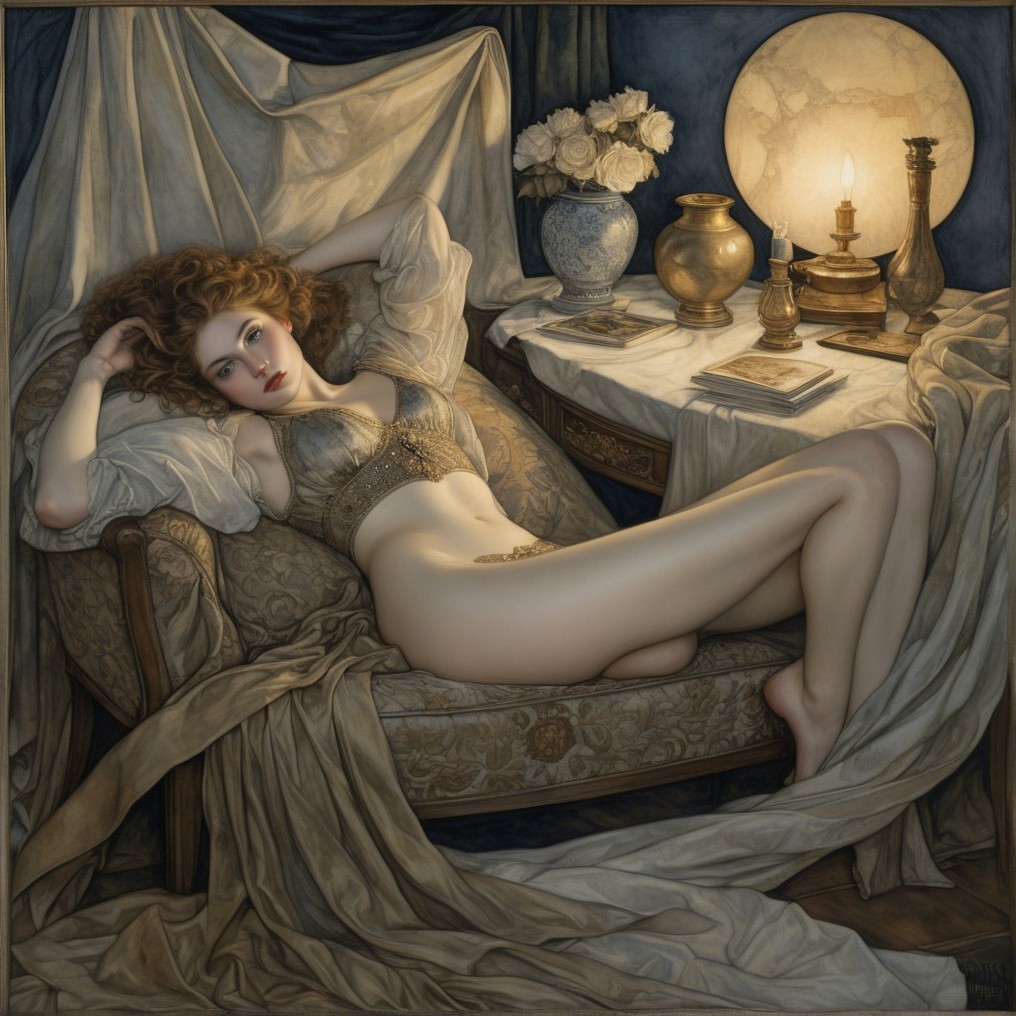 A serene woman lounges on draped fabric by the ocean, illuminated by a full moon. She wears a striking red bodice and gazes peacefully, surrounded by soft textures and natural beauty.