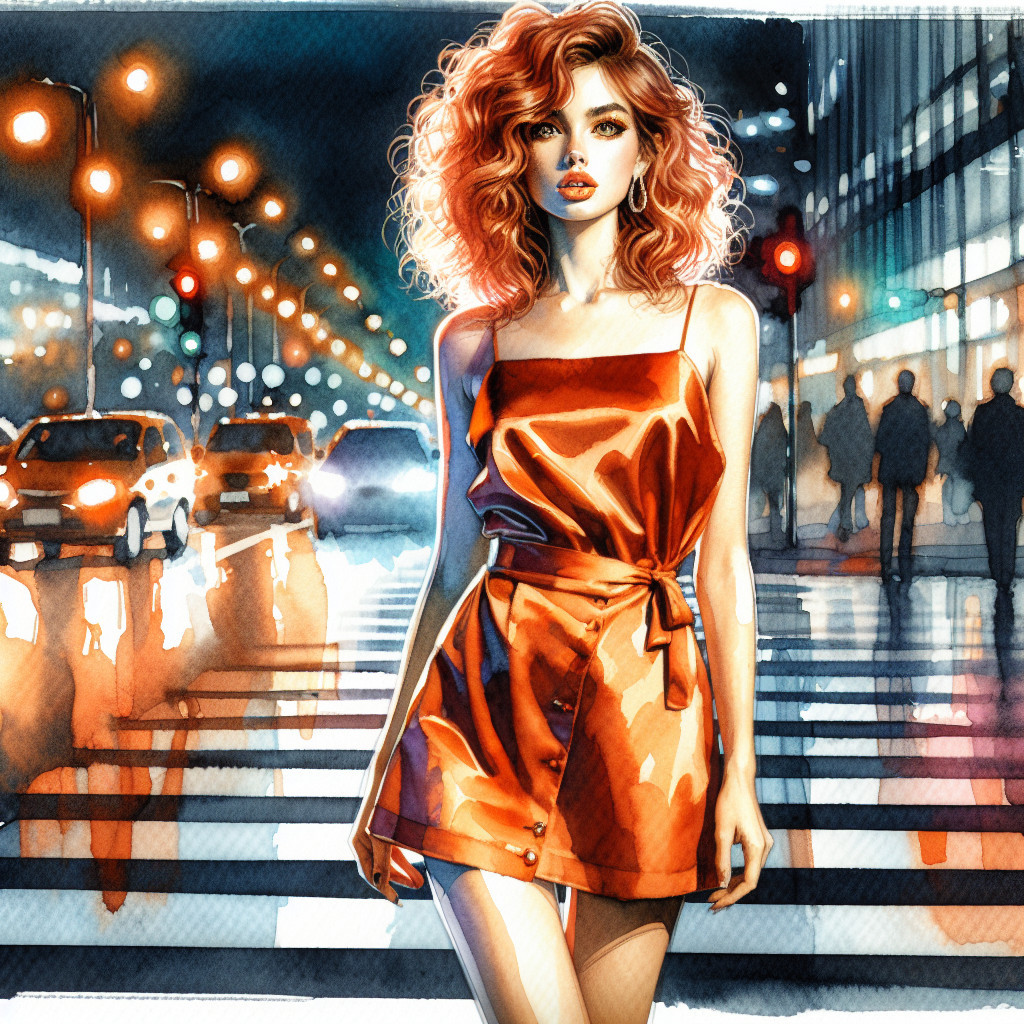 A watercolor painting depicts a beautiful woman with red curly hair, wearing a loose-fitting reddish-orange spaghetti strap dress with a tied belt, standing on a crosswalk at night. She has striking brown eyes, dark eyeliner, and orange lipstick. Her left hand is at her side, and she has