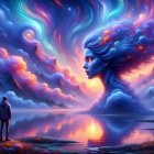 A vibrant scene unfolds with two figures standing by a tranquil lake, reflecting a surreal cosmic face surrounded by colorful clouds and majestic mountains, illuminated by a radiant sunset.