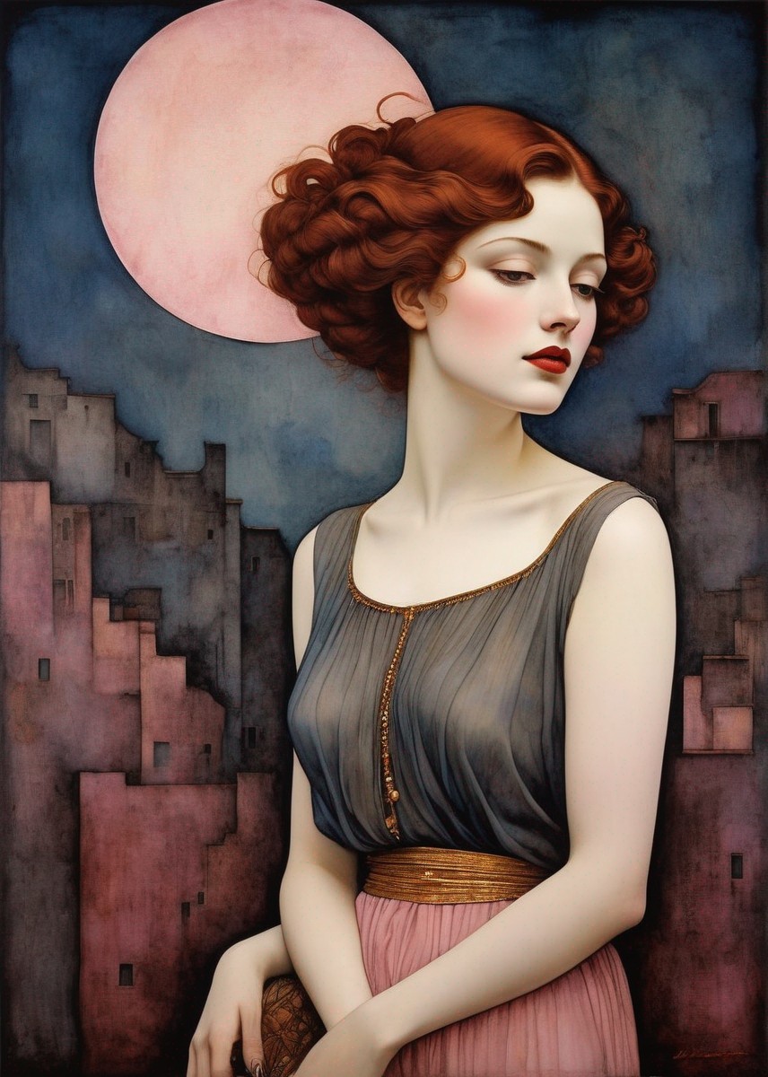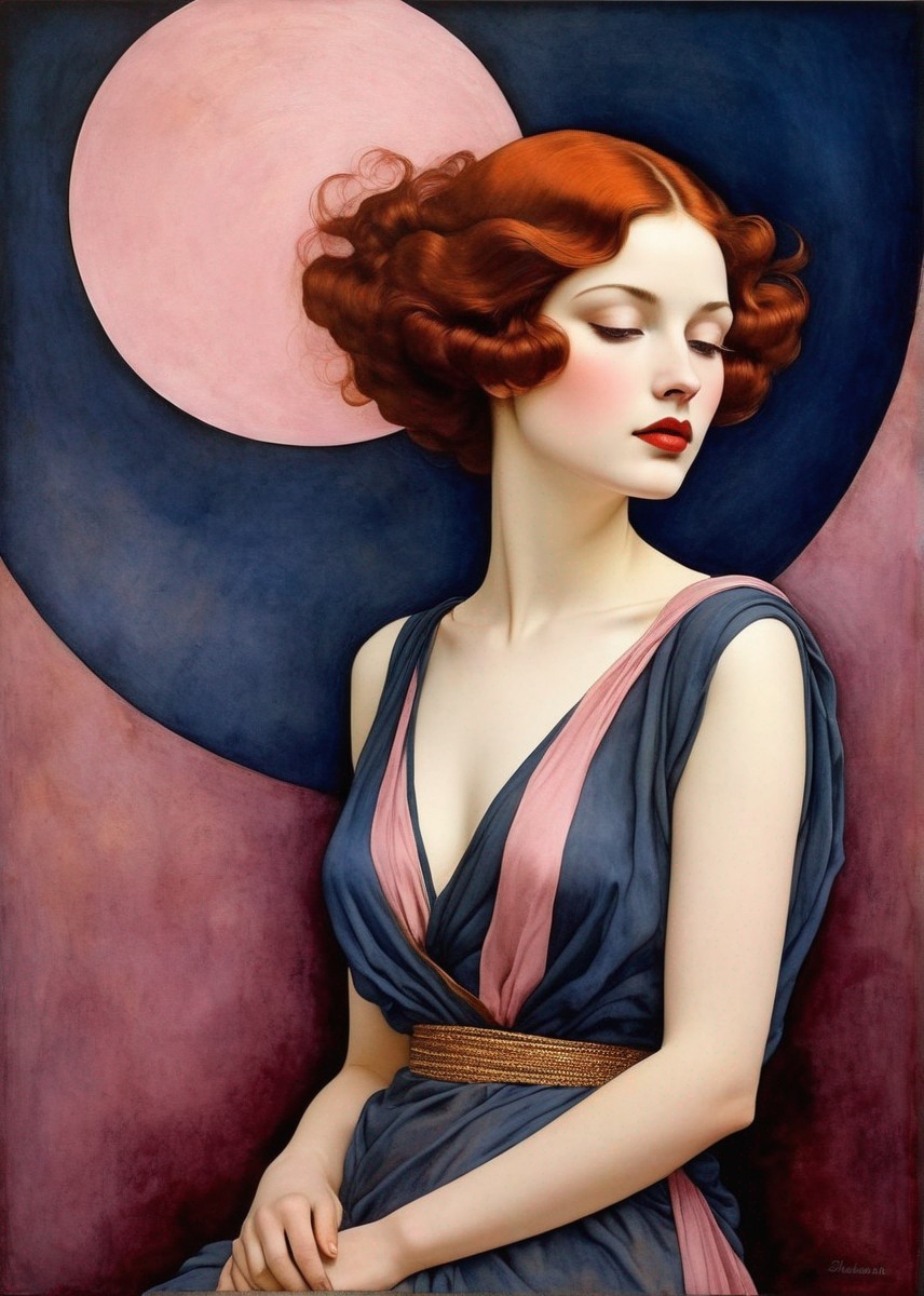 An illustrated female figure with intricate jewelry and a decorative halo, featuring a blend of blue and gold tones, exuding elegance.