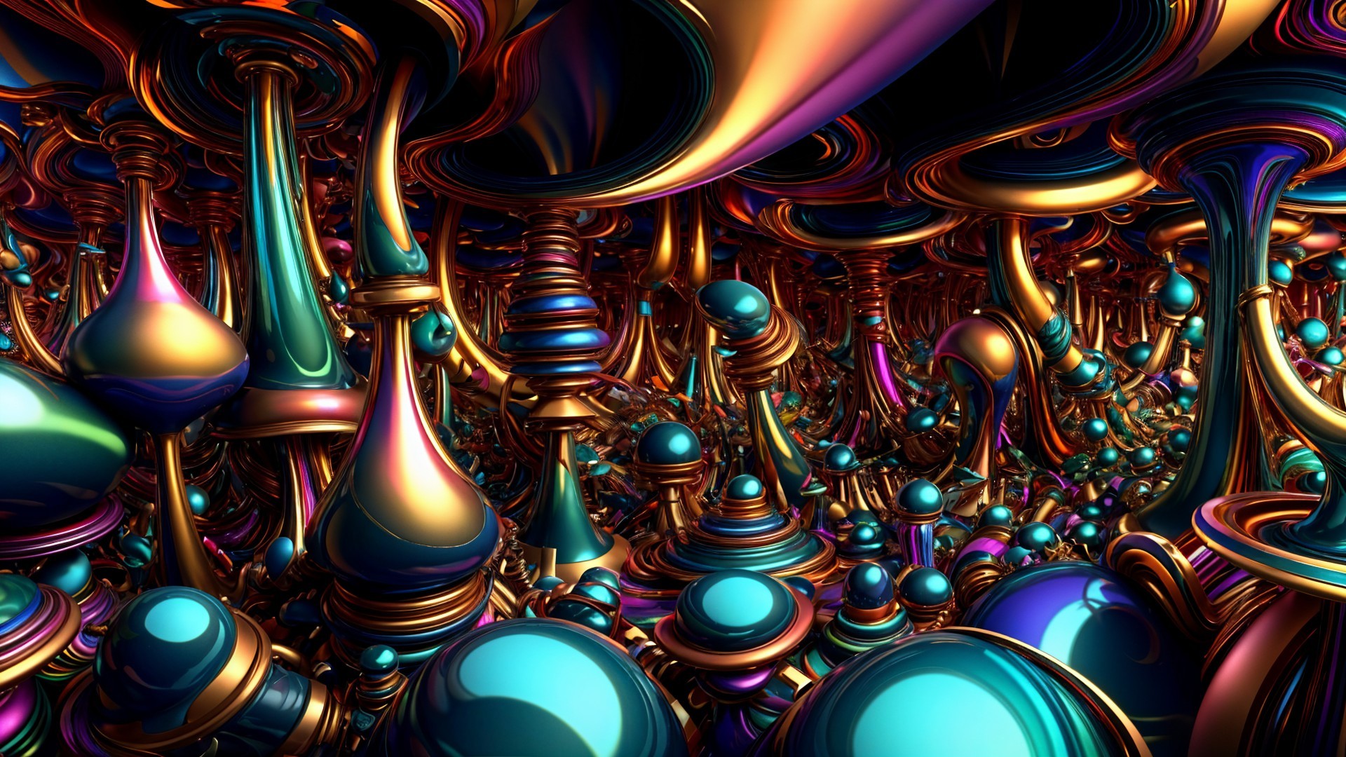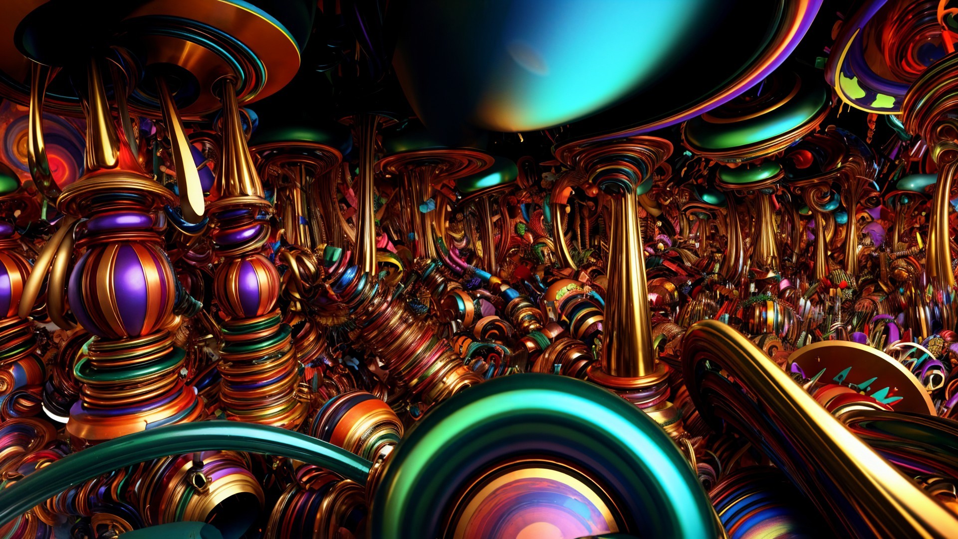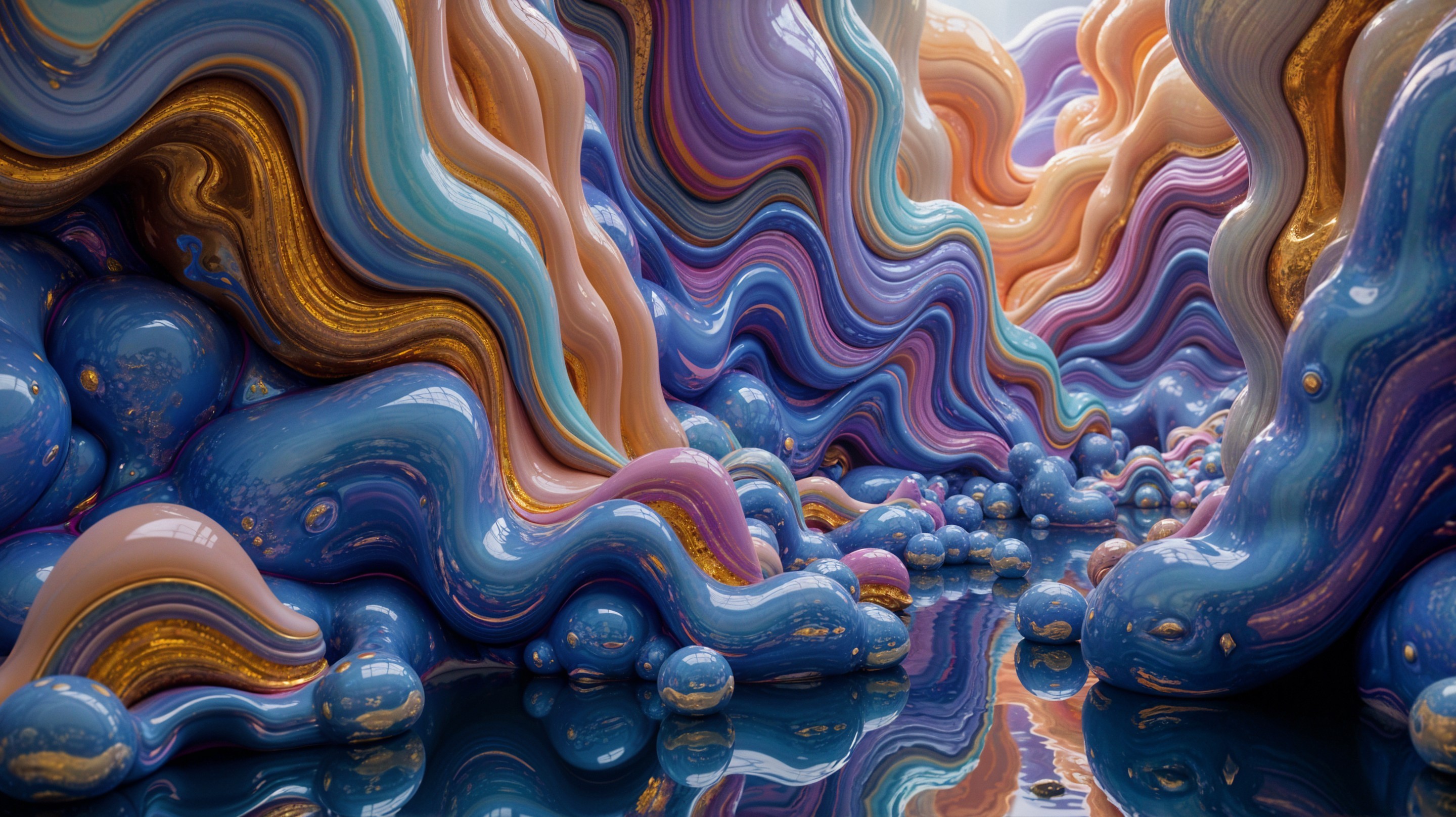 A swirling landscape of vibrant colors and flowing forms merges into a serene waterway, reflecting a glowing sunset. The scene evokes a sense of harmony and fluidity in nature.