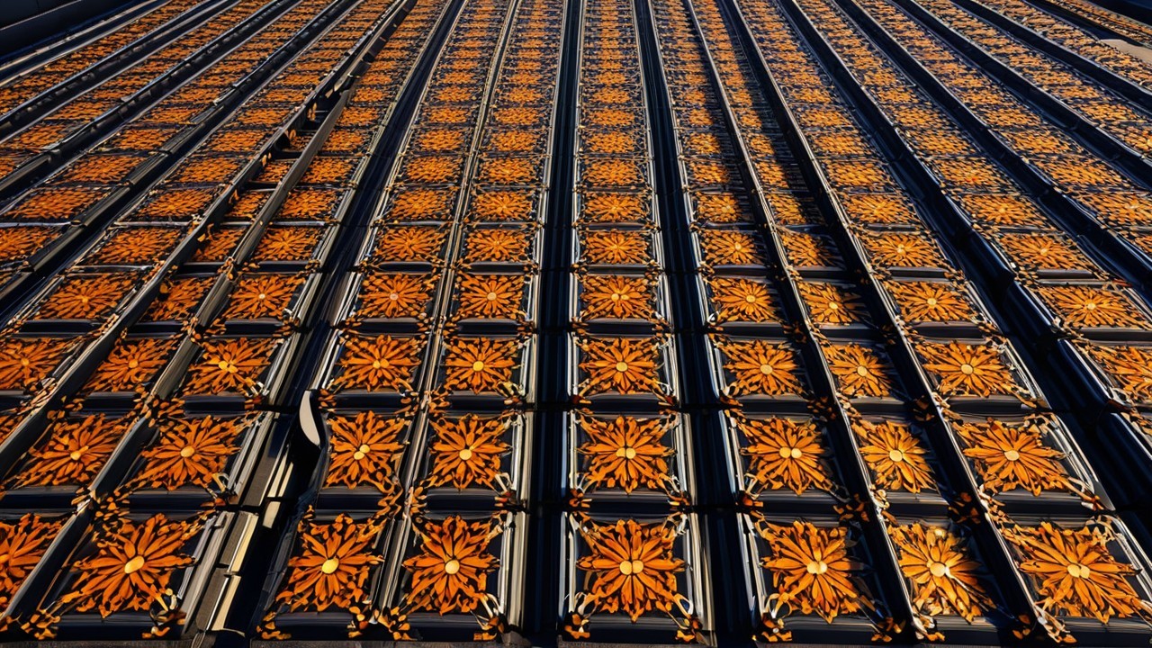 The image features a vibrant floral pattern with ornate orange flowers and dark green leaves set against a deep black background, creating a striking contrast and intricate design far away from bright origin ones..