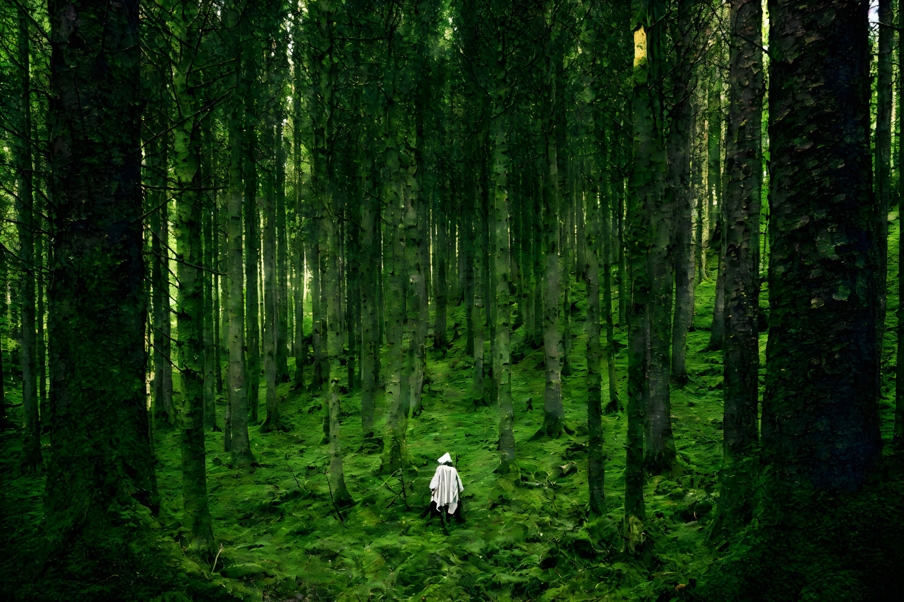 A fantastical landscape with towering, spiral-patterned mountains under a night sky dotted with planets and floating islands. Watch a video of a forest morphing into this