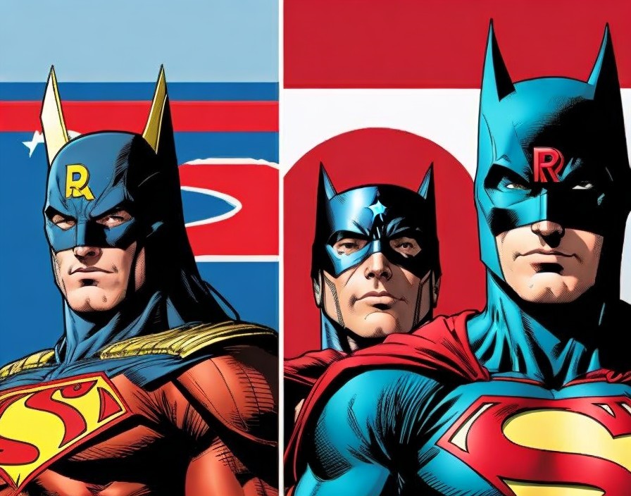 Female superheroes in Superman and Batman themes on split red and blue backdrop