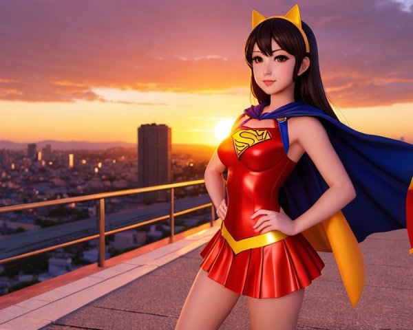 A vibrant anime superheroine with colorful rainbow-themed attire, showcasing her playful charm and strength. Her dynamic pose and sparkling accessories embody joy and courage in a fantastical world.