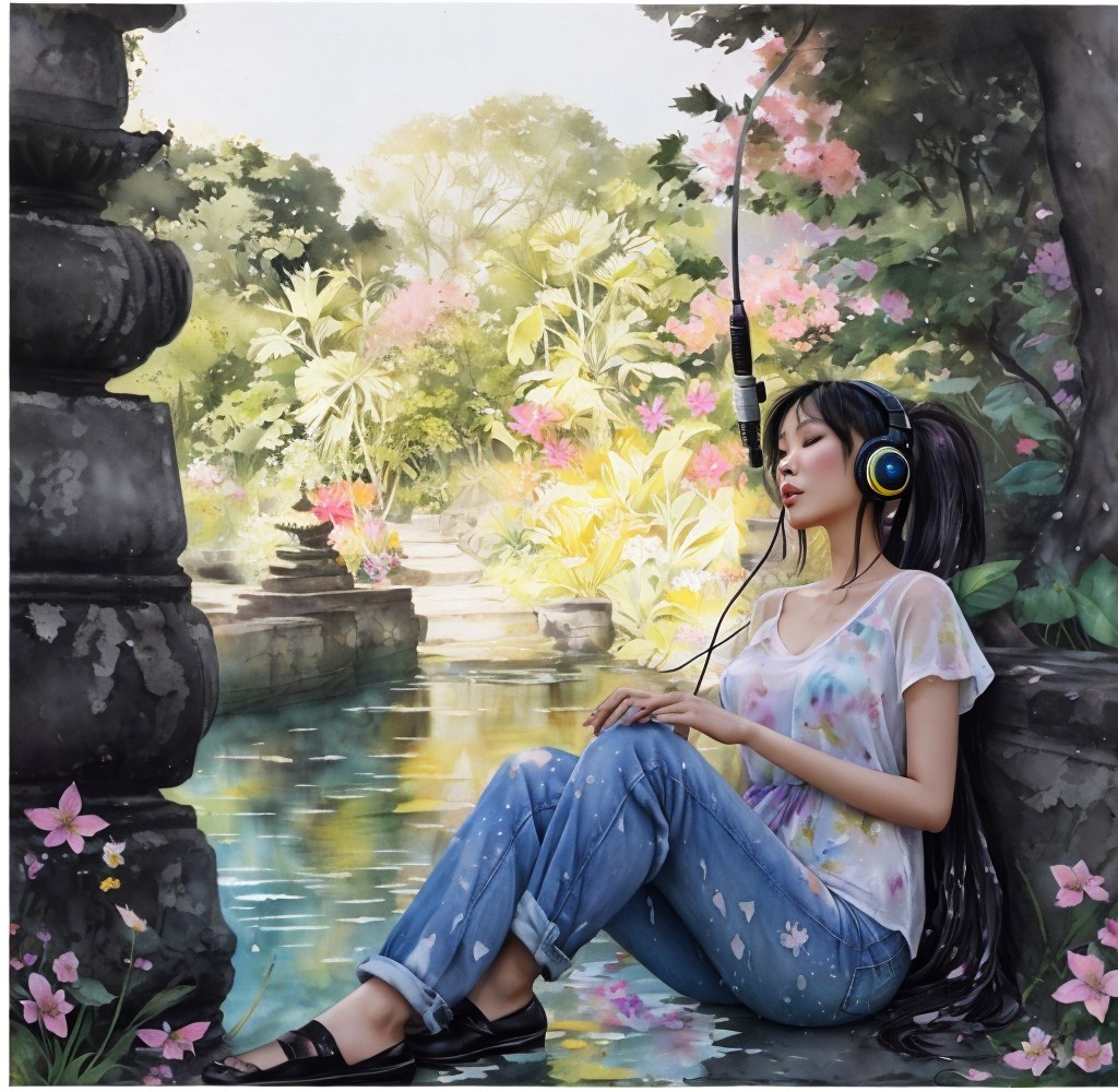 drawn with ink and a scratching, splashing, blotting quill pen, irregular stroke, squiggly line, evocative. colored with dirty aquarelle, splatter, overspray of color. Create a image featuring a very beautiful busty slender young vietnamese woman lying on her back in a park surrounded by flowers und butterflies. She wears headphones attached to a walkman and she is reading a big ancient book. She is looking very dreamy and happy. Her blonde hair is loosely styled in a bun with many loose tendrils framing her face. The woman wears a revealing t-shirt and shorts. Bare feet. Around her everything is colorfull, further away and to the edges of the picture everything dissolves into suiggly lines and abstraction, intricate, linty, fuzzy, twirly Masterpiece, gorgeous, beautiful, awe striking, breath taking, evocative, sumptuous, aesthetic, unique, HD,style of by zettel