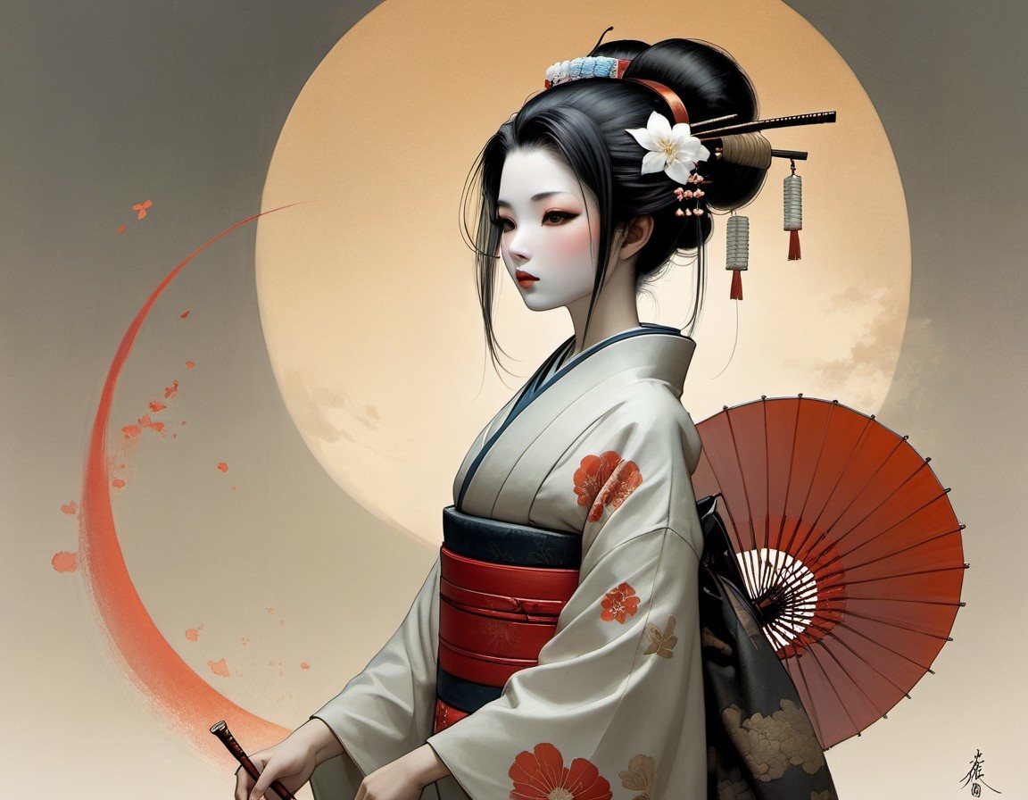 An illustration of a woman in traditional Japanese attire with an umbrella, set against a backdrop of a stylized sun.