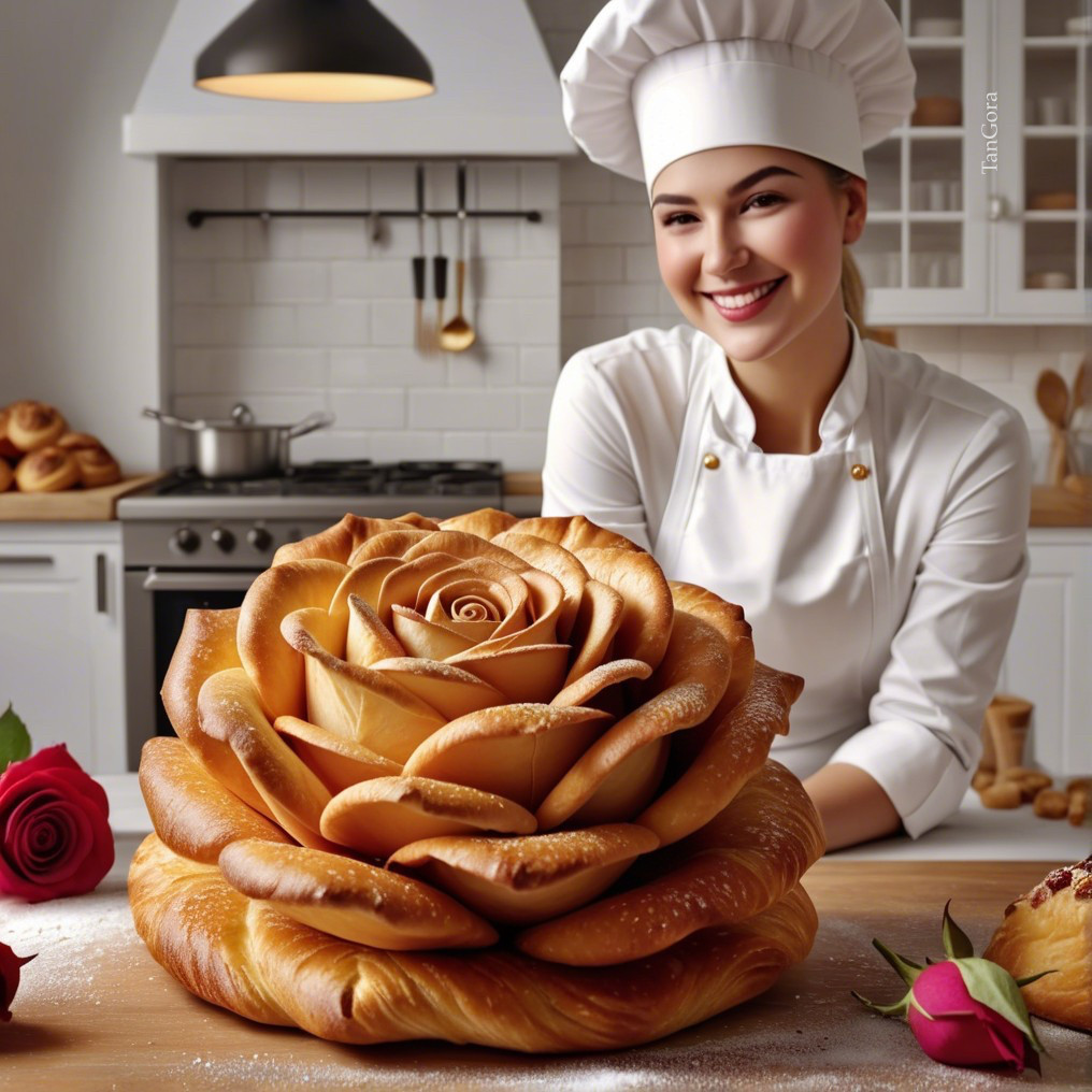 A cheerful baker in a white chef's hat presents an intricate rose-shaped bread centerpiece in a cozy kitchen, adorned with fresh roses and a sprinkle of flour on the wooden table.